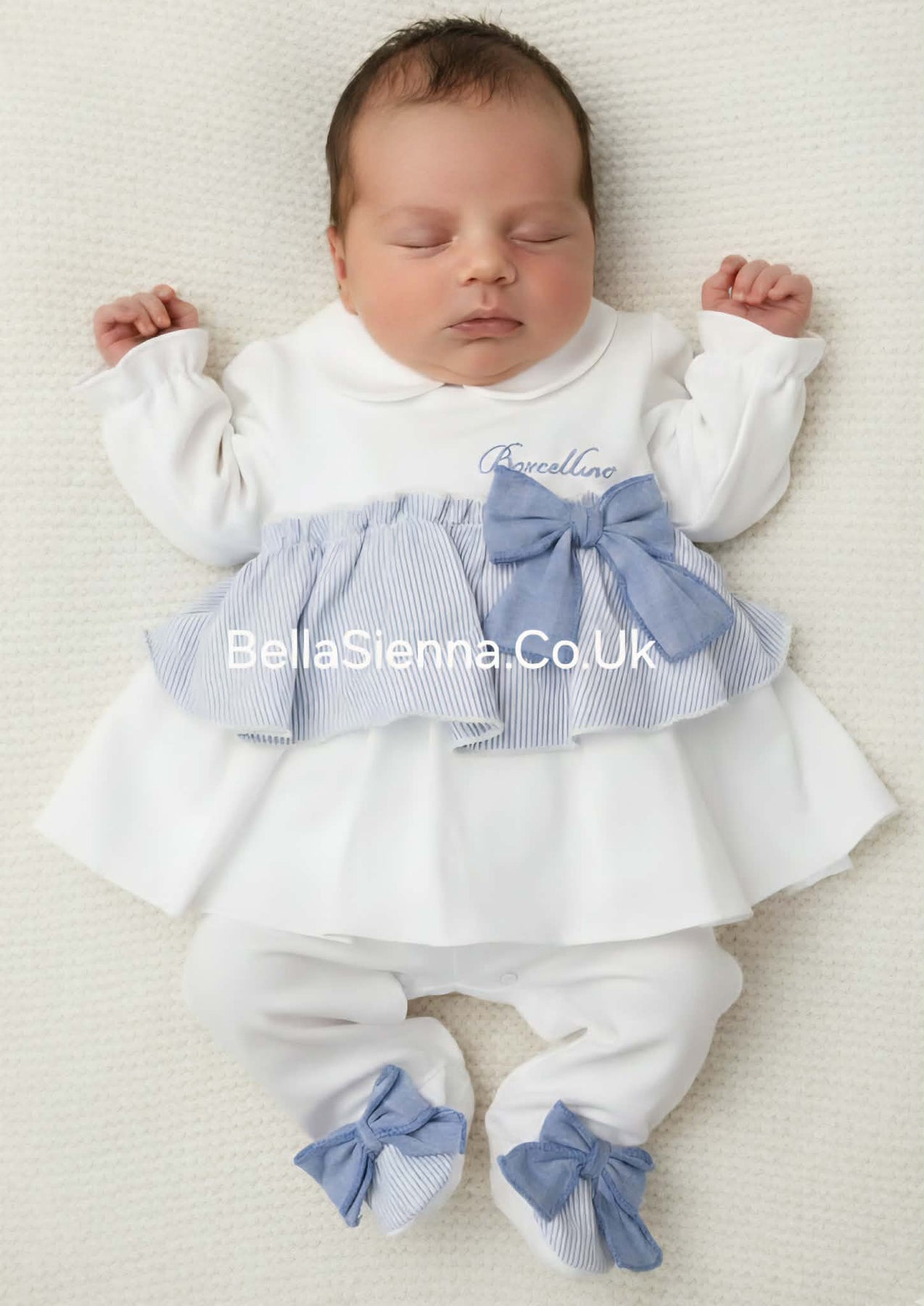Absolutely stunning!!! Barcellino High Quality Italian Baby girls Two piece outfit with pretty bow on the front and ruffles around the bottom the top also has the logo of Barcellino on the front this is truly a beautiful outfit for your little princess. This would make a perfect gift for that precious little girl and comes beautifully gift boxed.