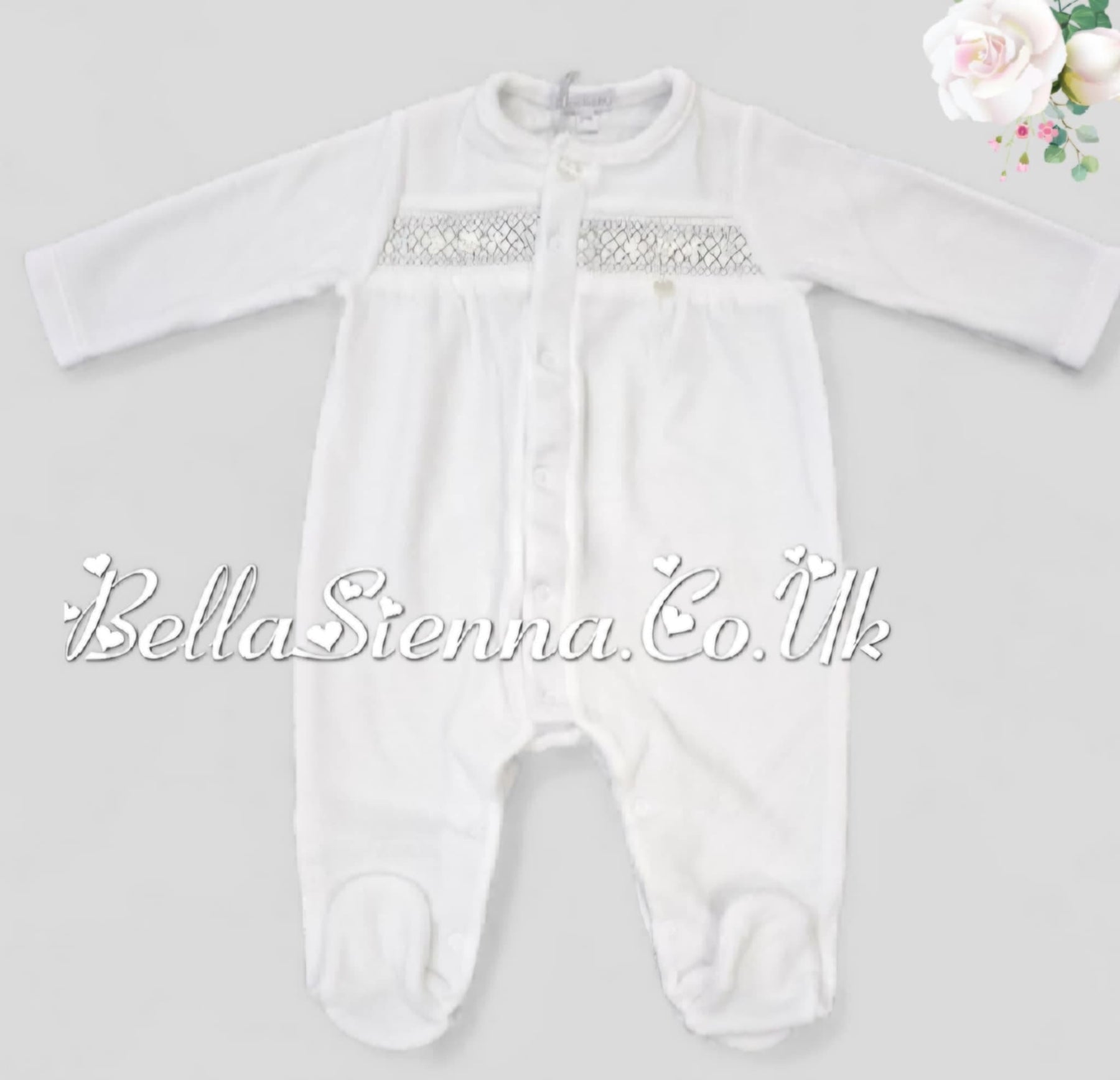 Unisex White Velour With Grey Smocking Detail Sleepsuit Babygrow - PP0303