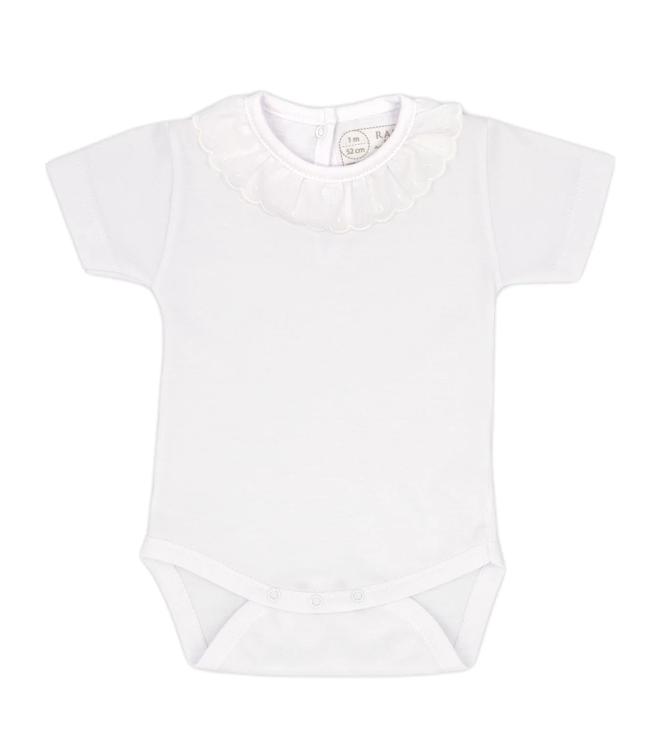 Short sleeved bodysuit for newborn. Round neckline with ruffles. Snap-button fastening on the back to allow the garment to be put on easily. Snap button fastening at crotch for easy dressing.