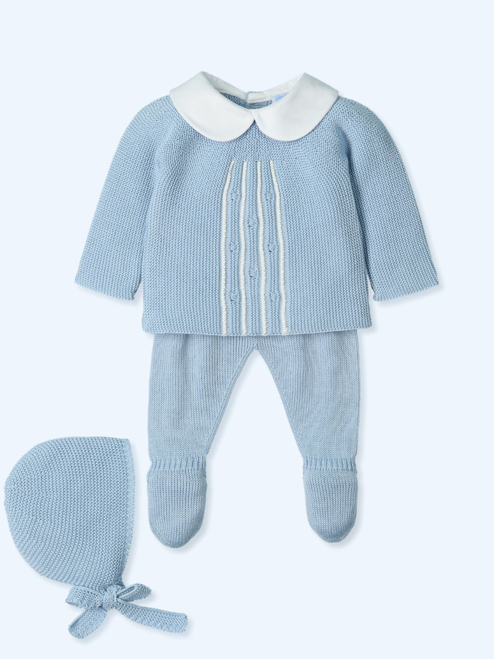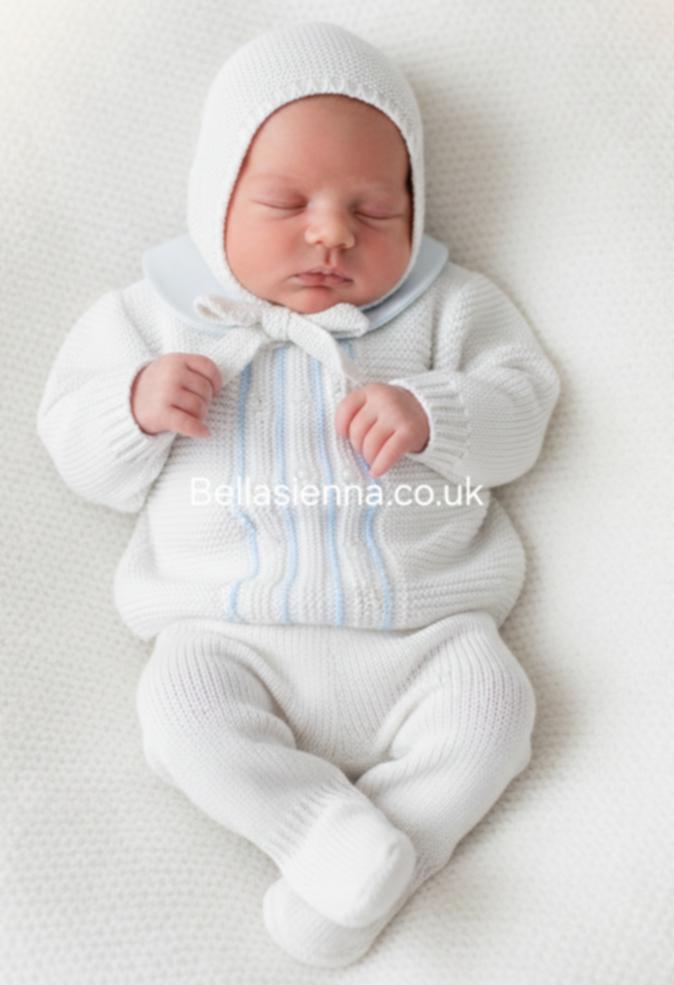 Mac ilusion 9605G BABY THREE-PIECE OUTFIT INCLUDES KNITTED SWEATER WITH PETER PAN COLLAR, LEGGINGS AND BONNET - White & Blue