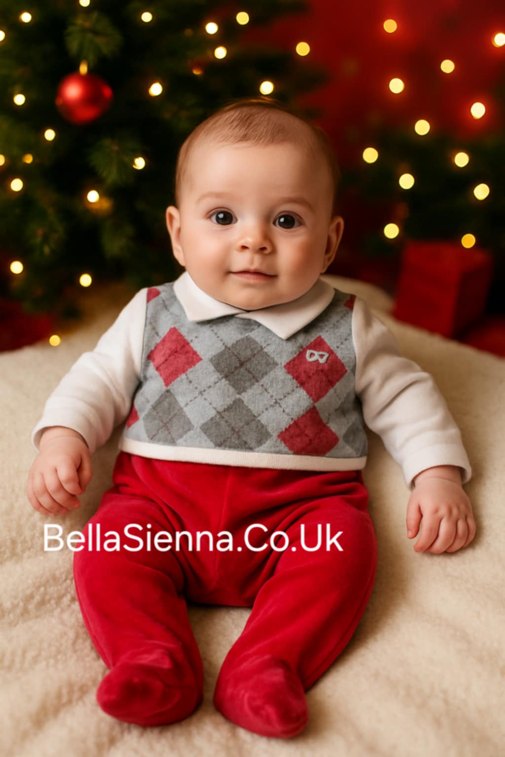 iDo Baby Boys Perfect Christmas Red And Grey Velour Babygrow 8016
