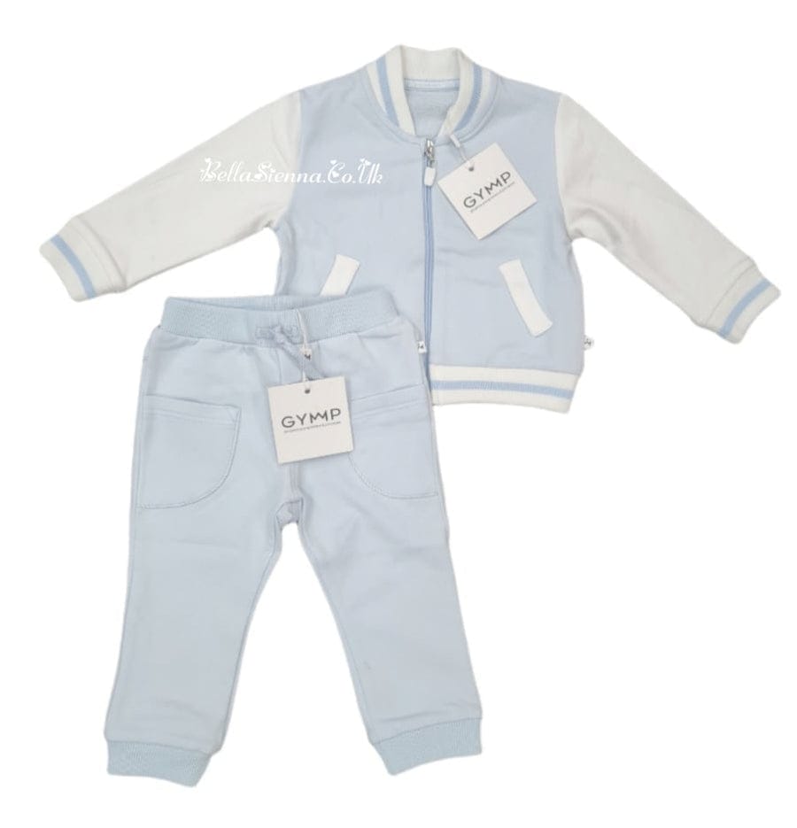 GYMP boys pale blue tracksuit made in soft stretchy jersey material with a blue stitched lettering to the front.