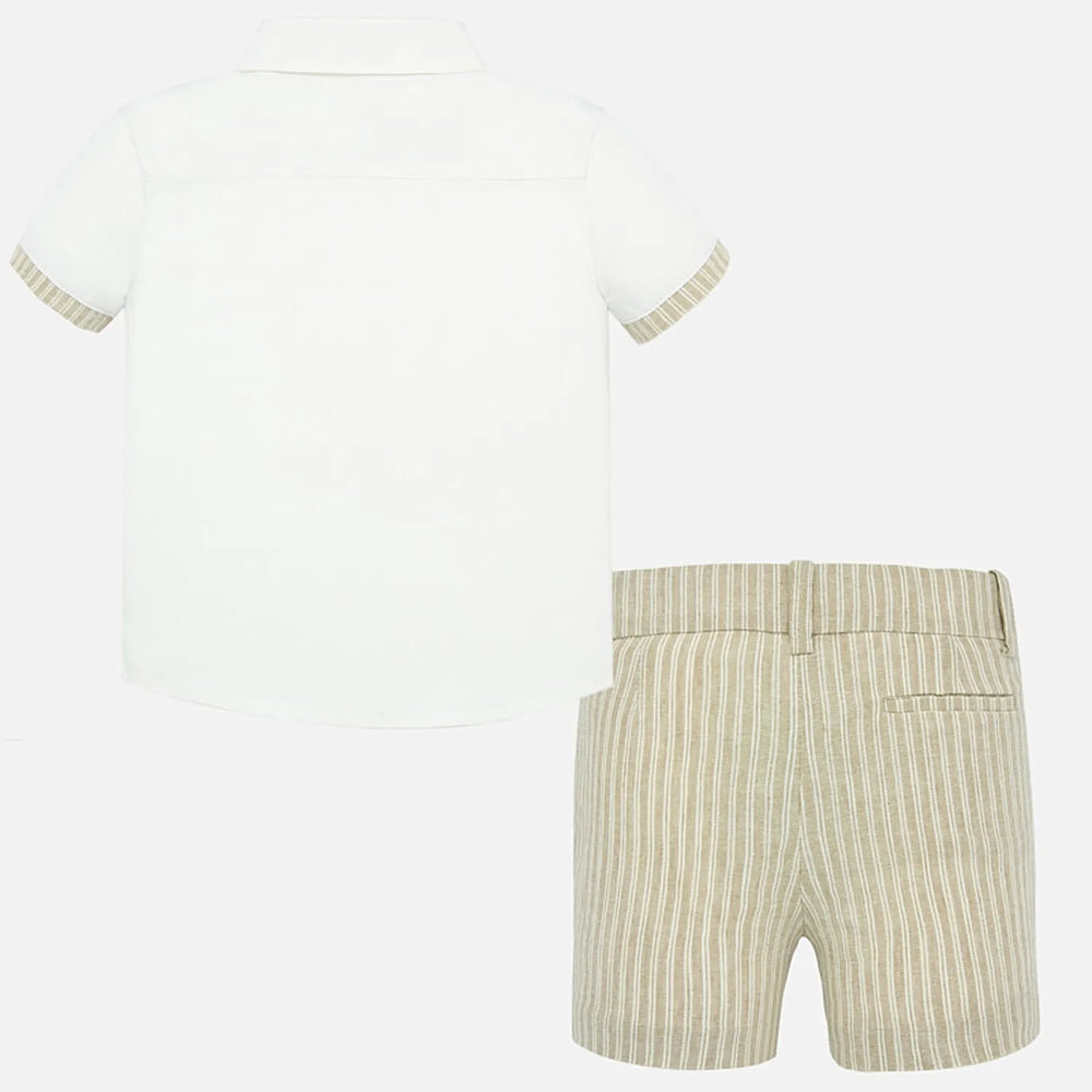 Smart casual shirt and shorts set for boys by Mayoral, made in a lightweight linen and cotton blend. The white collarless shirt has short sleeves, button fastenings and a subtle embroidered logo on the chest. The white and beige striped shorts have useful pockets and an adjustable waistband with and button fastening.