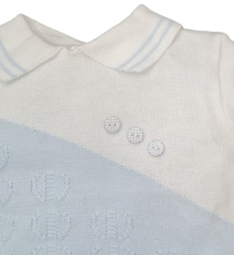 Pretty Originals Baby Boys 2 piece set a traditional short sleeve polo top with knitted collar and blue trim white polo top with ribbed sleeves and 3 buttons on the chest - pierced knit on the sleeves and front, comes with knitted shorts with ribbed elasticated waistband. A traditional style for boys.