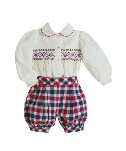 Pretty Originals boys traditional 2 piece set of long sleeve traditional shirt with pointed collar and smocked panel on the chest, buttons up the front and on the cuffs - comes with red and navy check bloomer shorts - this set can be buttoned together.