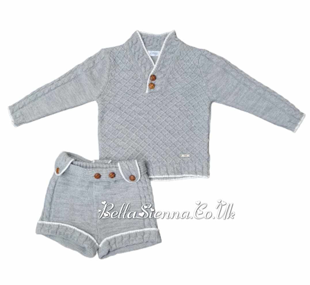 Long-sleeved grey knitted knitted design and contrast piped white trim hem two button fastening paired with knitted shorts with knitted belt and detail buttons and stylish.