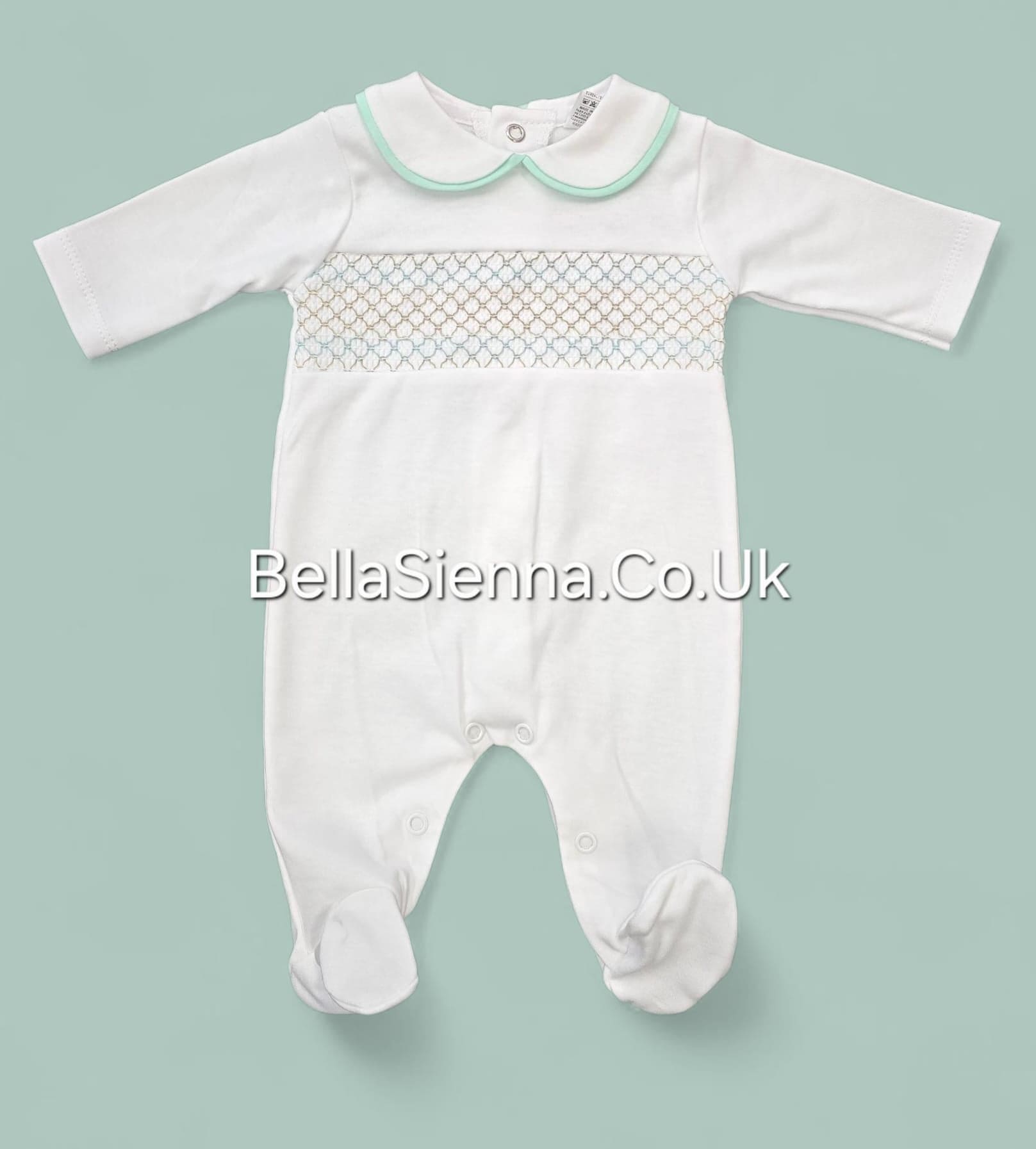 Unisex White & Mint Green Smocked All In One Babygrow - SG68