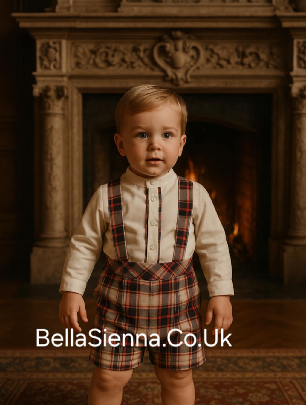 A classical off white and red shorts set for little boys by Spanish brand Miranda, made in softly woven fabric. In a smart collarless style, the shirt has button fastening, trimmed in a tartan fabric. The tartan dungaree shorts have shoulder straps that cross-over at the back. They are fully lined in voile, and have button fastenings for effortless dressing.