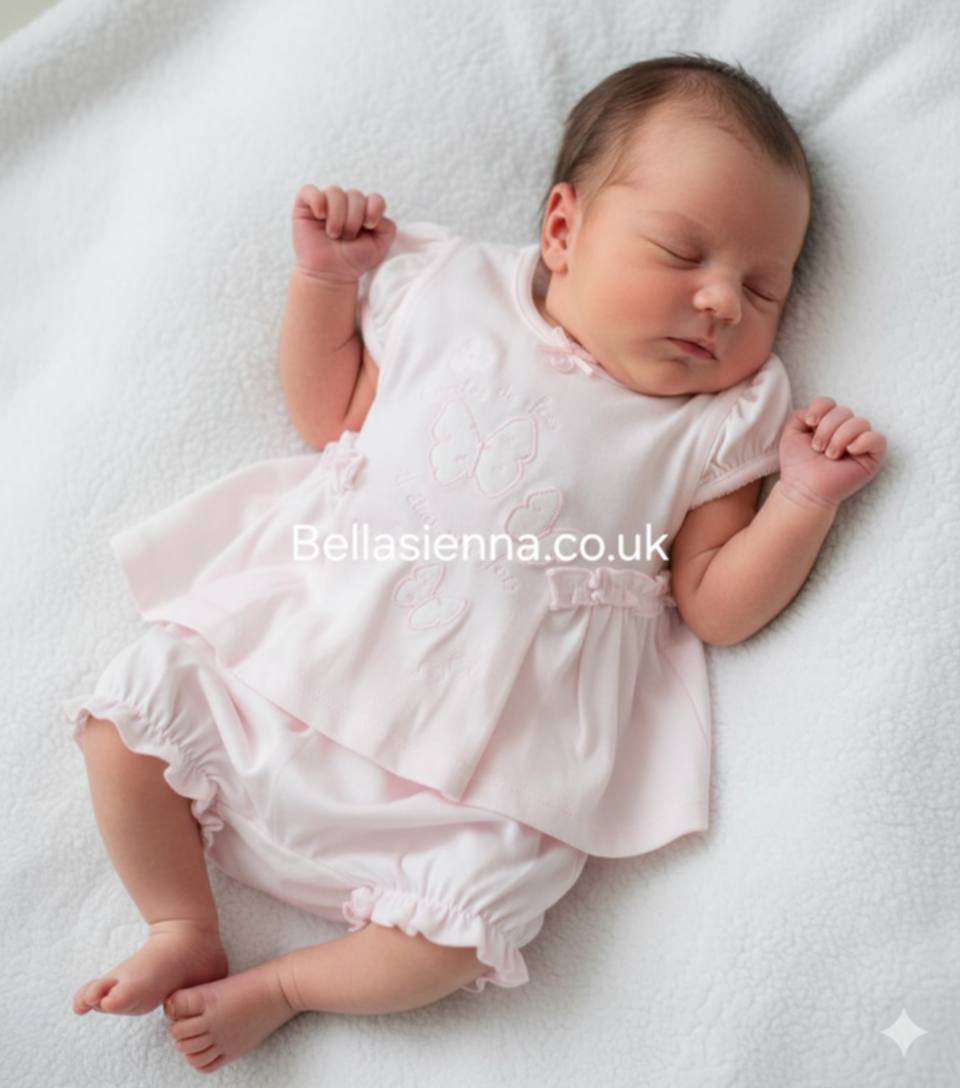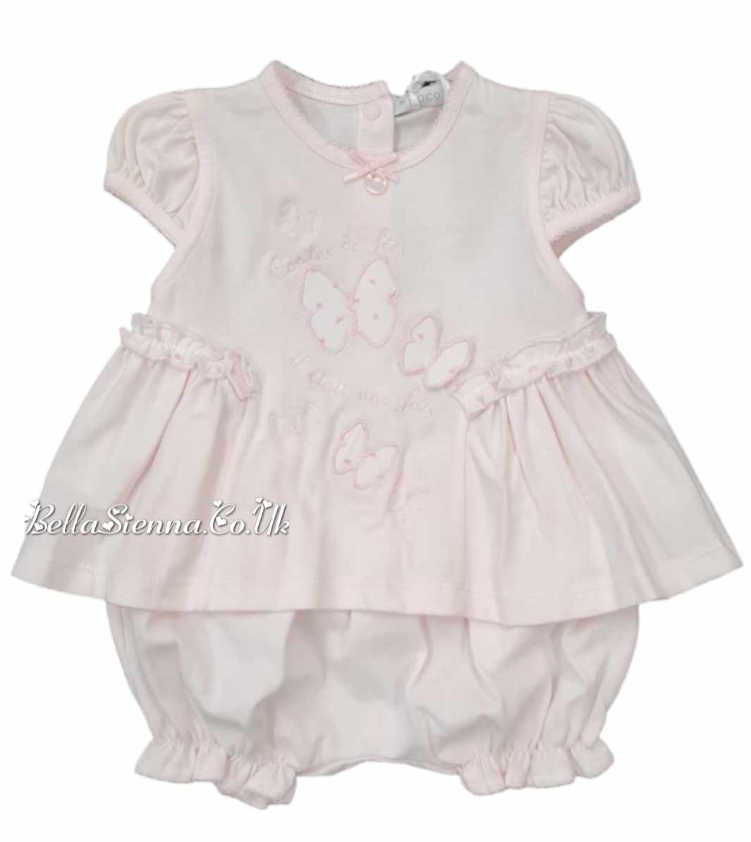 The Coco Collection Dress and Bloomers Set. With delicate white and pink butterfly prints, a round collar, and a cute bow popper fastening at the back, this dress is so sweet. Paired with matching ruffle bloomers featuring pink trims, this set is perfect for any occasion.