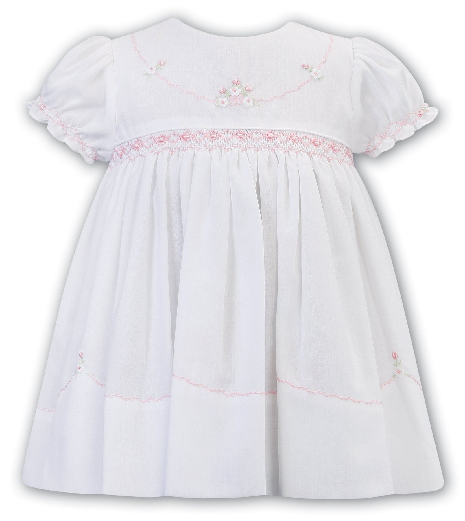 Expertly crafted by Sarah Louise, this White & Pink Smocked Dress has intricate smocking and embroidered flowers for a charming touch. With its buttoned back, this dress is not only beautiful, but also easy to put on. Perfect for special occasions, your little one will look and feel beautiful in this dress.