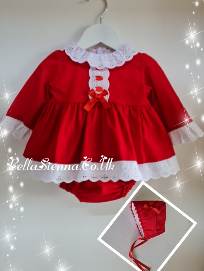 Eva Class 3 Piece Red & White Dress, Pants & Bonnet Set - 12002 - Winter