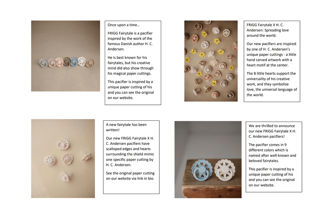 FRIGG Fairytale with scalloped edges and hearts surrounding the shield mimic one specific paper cutting by H. C. Andersen. The 8 little hearts support the universality of his creative work, and they symbolize love, the universal language of the world. This is the inspiration that lies within the FRIGG Fairytale pacifiers: They are approachable for everyone because love is a language, everyone can speak and understand.
