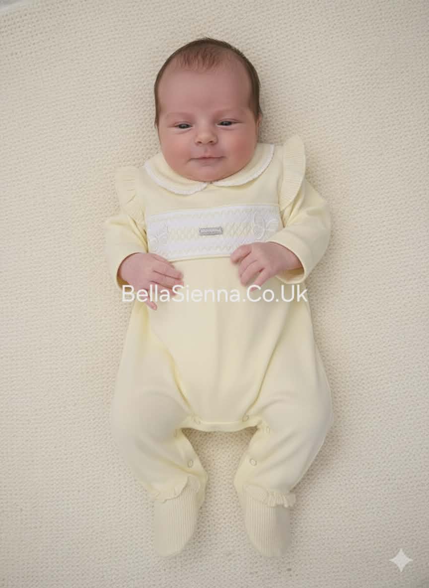 Amore Girls Lemon & White Classic Smocked All In One Babygrow Sleepsuit - AM0074