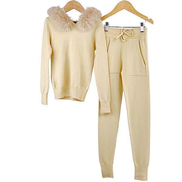 Beige Faux Fur Hood Co-ord Lounge Set - 3002