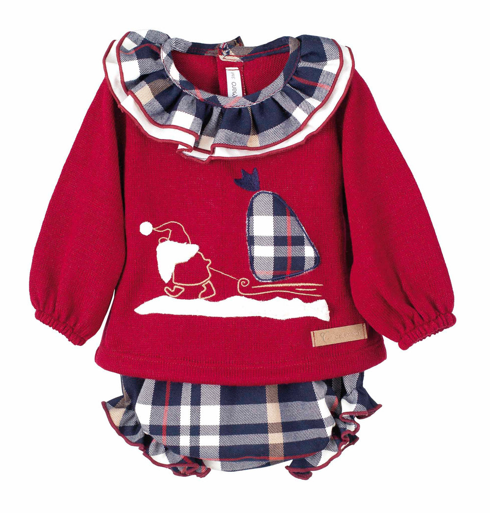 Calamaro Girls Burgundy & Navy Check Christmas  Jumper & Shorts Set With Frilly Collar - 17903