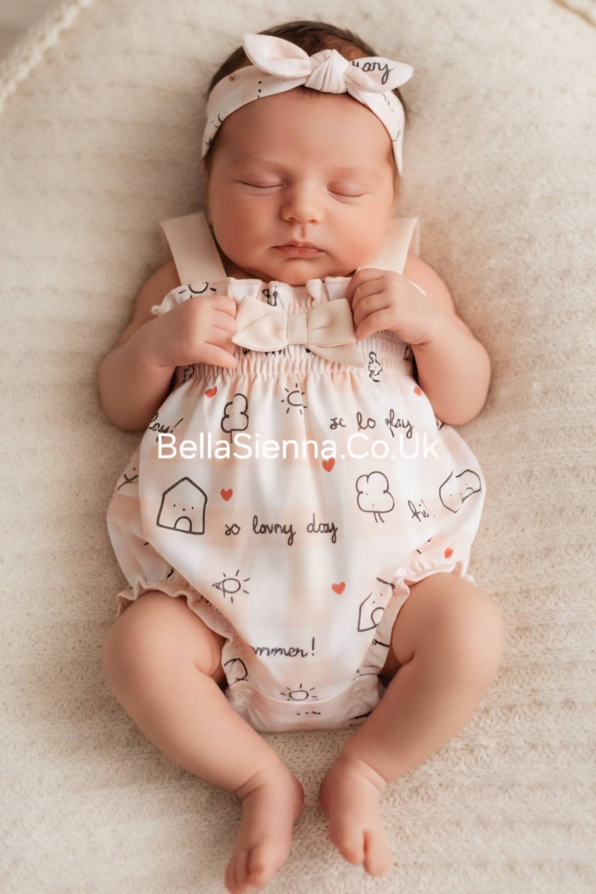 Bodysuit romper with pretty matching headband for newborn girl. Made from soft elasticated cotton fabric. Sleeveless bodysuit romper. Snap-buttons to fasten. Decorative bow applique. Patterned design. Original headband. This is a perfect accessory to complete this pretty look.