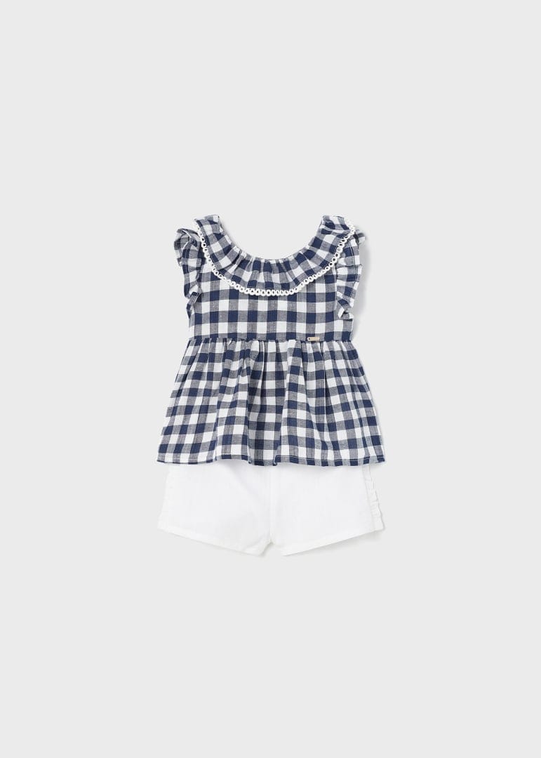 Matching two piece set for baby made up of a long, loose shirt and shorts. Fresh and contemporary fabric with linen.
