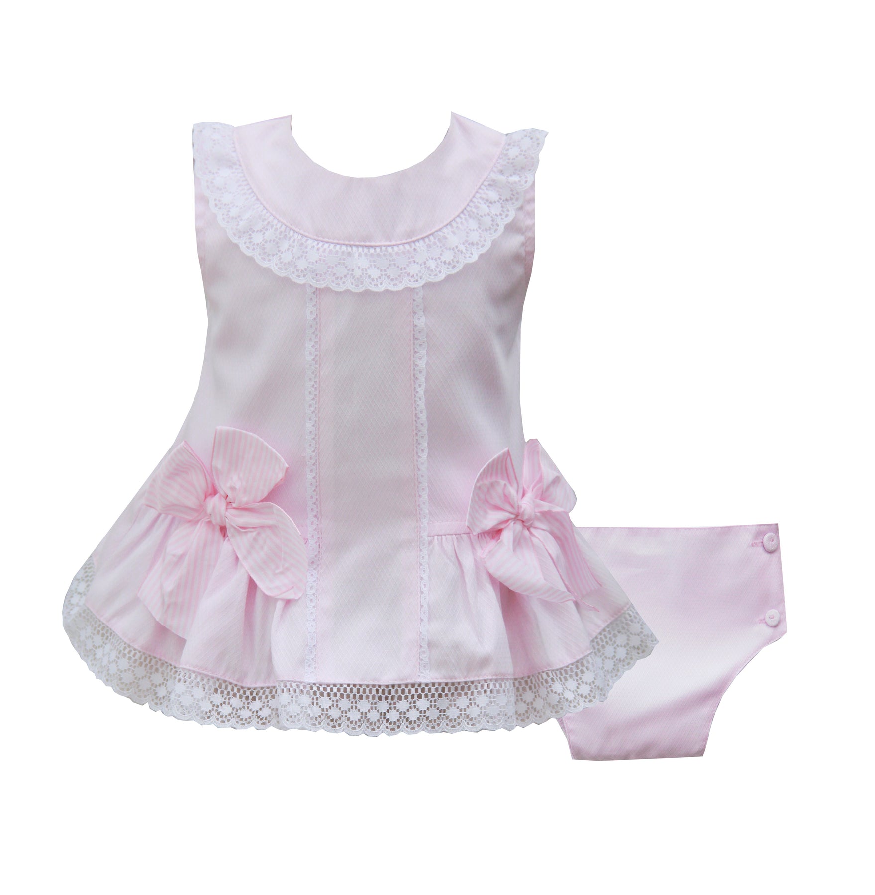 Pink and white dress pants and matching headband set for baby girls by British brand Pretty Originals. Made in lightweight polycotton, the dress has white lace on the front and two pink stripe bows. The hemline has a white lace trim.