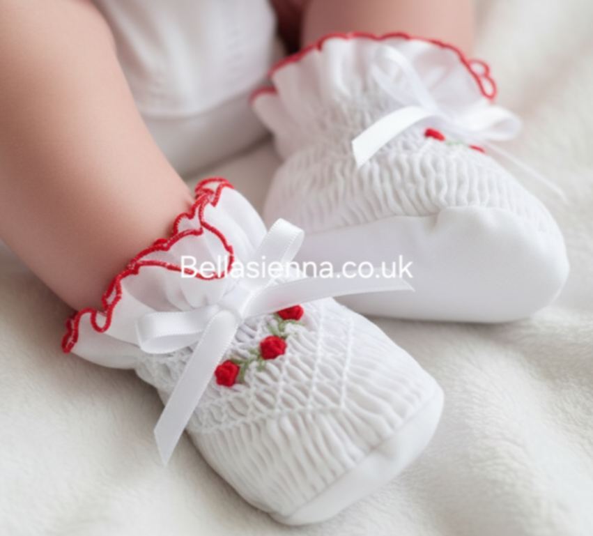 Sarah Louise White & Red Hand Smocked & Embroidered Baby Booties - 004407