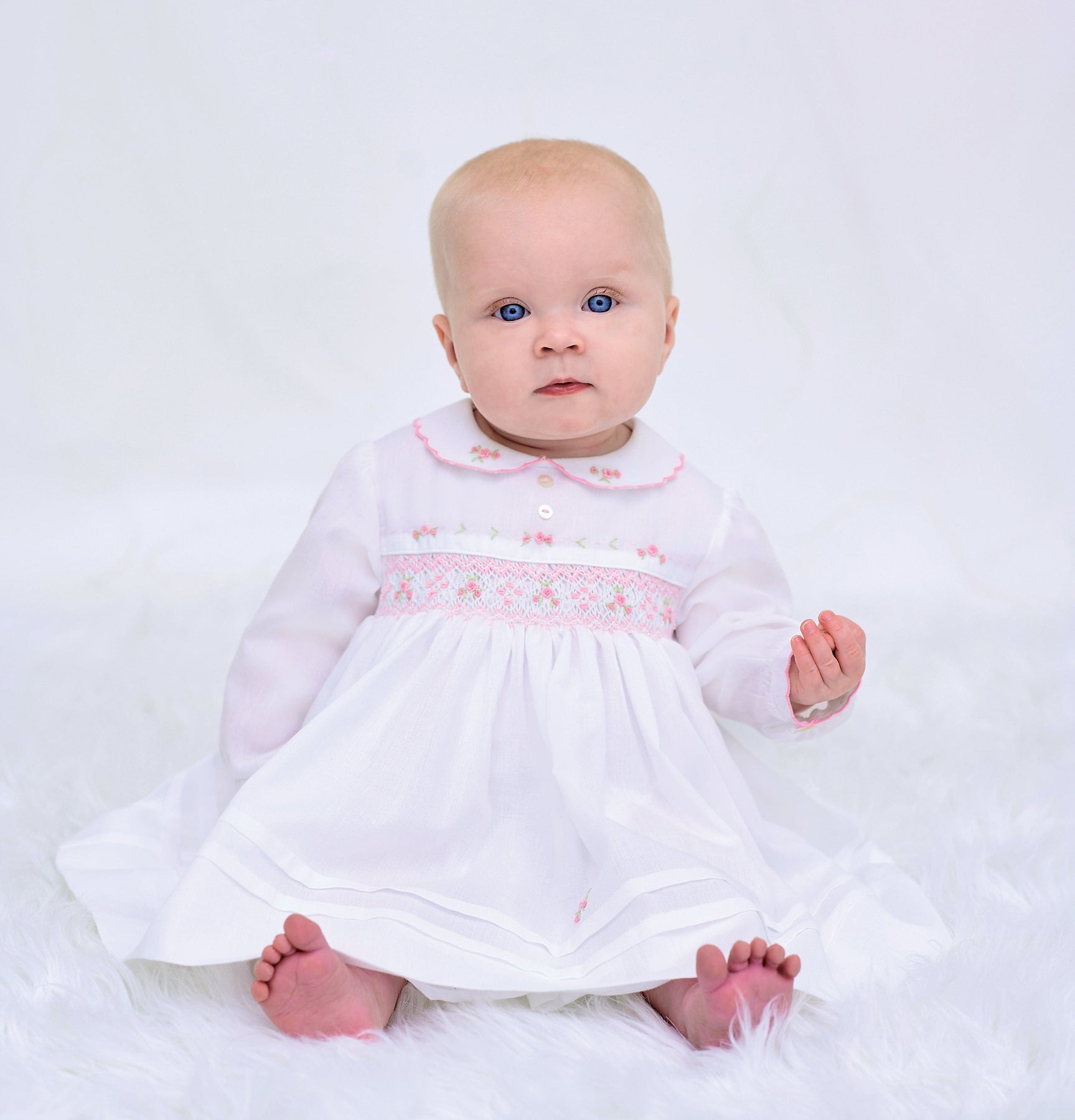 Sarah Louise White & Pink Smocked Long Sleeved Dress! The classic style and intricate embroidery will have your little girl looking like a true princess. Enjoy this timeless look and create memories that will last a lifetime!