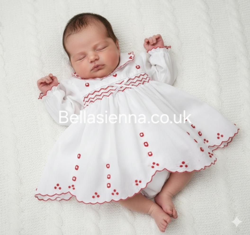 Luxury "Bella Sienna Exclusive" White & Red Front & Back Smocked Dress With Built In Underskirt & Matching Hair Band Or Clip & Pants