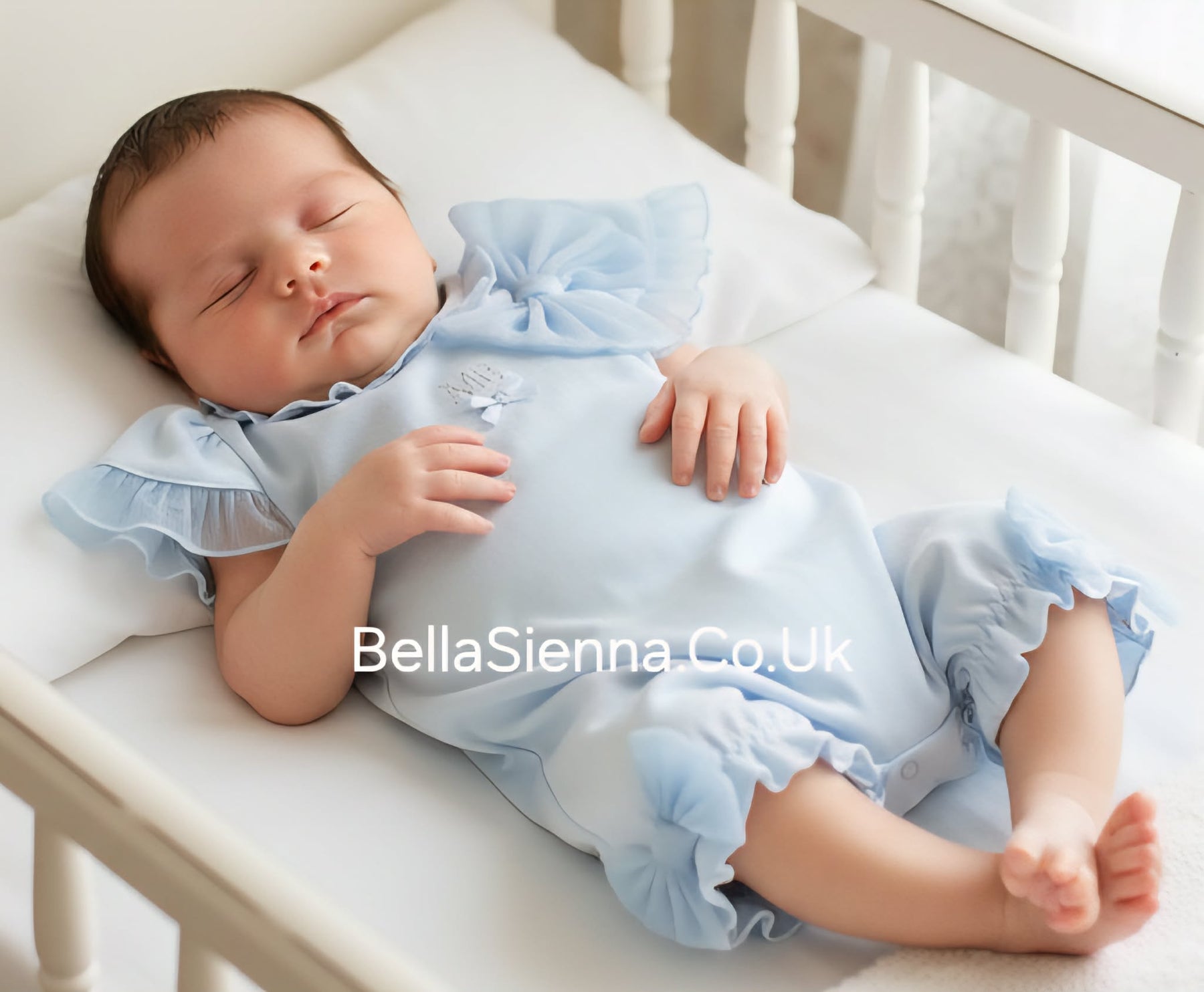 Mintini blue romper for girls features a delicate tulle bow detail and a diamante logo, adding a touch of charm to the design. Thoughtfully crafted with popper fastenings at the back and between the legs, it ensures convenient and quick changing without fuss. Ideal for daily wear or special occasions, this romper combines style and practicality with expert attention to detail.