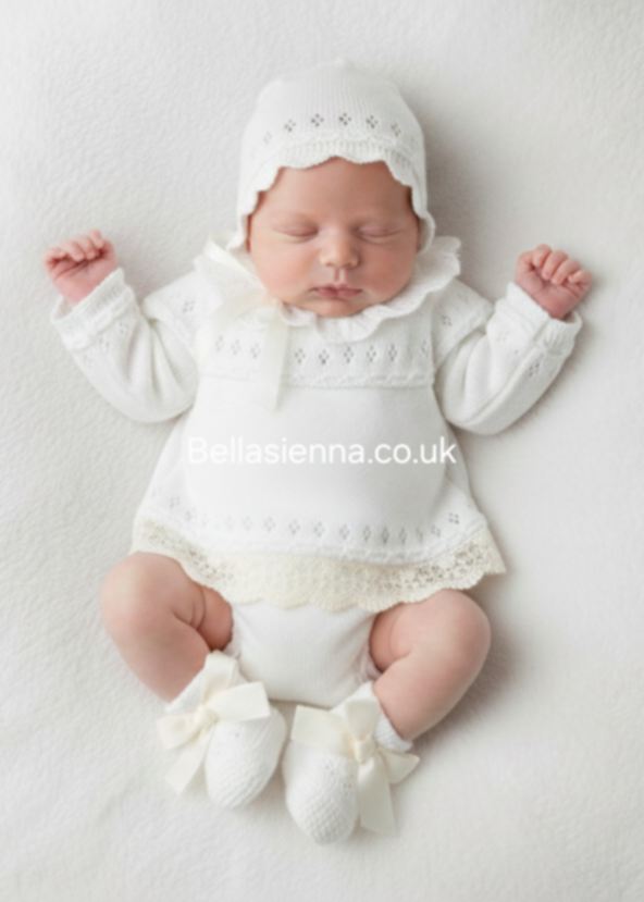 A truly beautiful four-piece set for baby girls set Mac Ilusion . With all items being made in a cotton blend, the white knitted outfit consists of long-sleeve top, bloomers, bonnet and a pair of booties. The crocheted tee has a rounded neckline with lace, long sleeves, buttons to fasten and lace accenting. The bloomers have an elasticated waistband, whilst the bonnet ties at the chin. The booties have cute bow appliques.