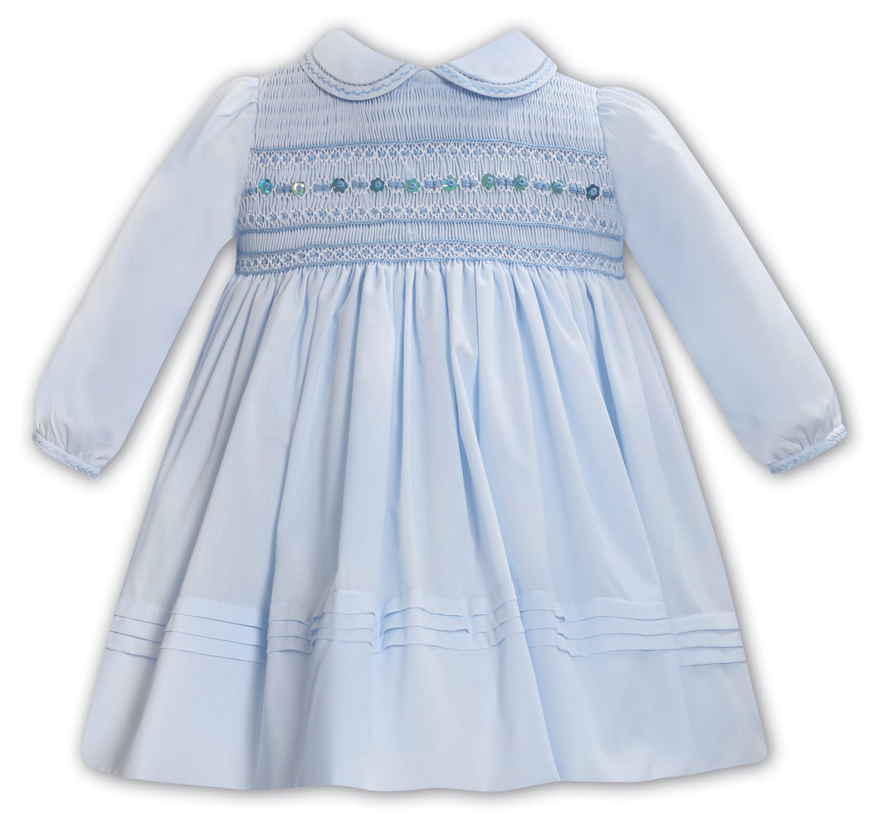 Timelessly elegant, this sweet dress features delicate hand-smocking, adorned with dainty embroidery at the front. An elegant lace and a feather stitch detailing graces the peter pan collar, adding a touch of sophistication.