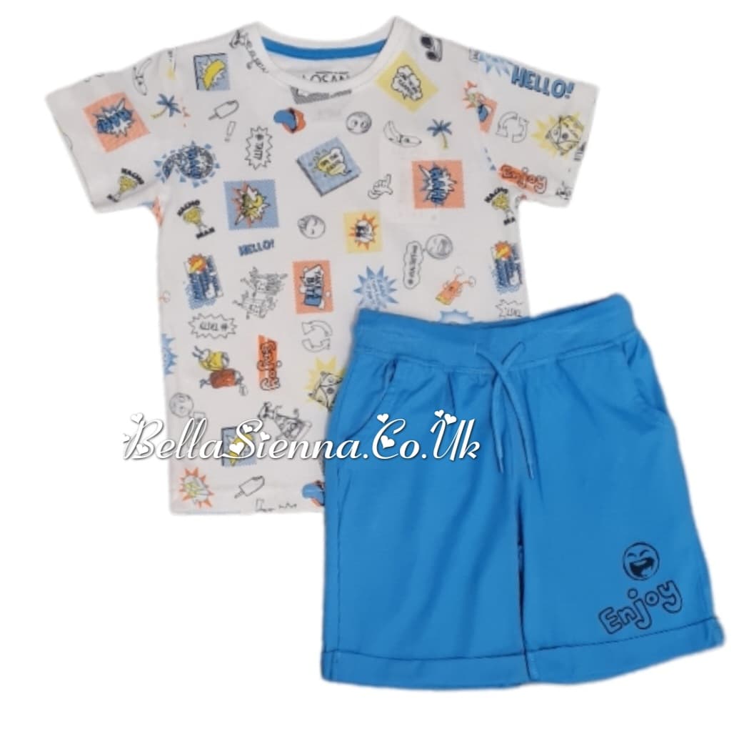 White t-shirt and shorts set by Losan. The printed short sleeve t-shirt with rounded neckline . It has blue shorts with an elasticated waist and slanted front pockets.
