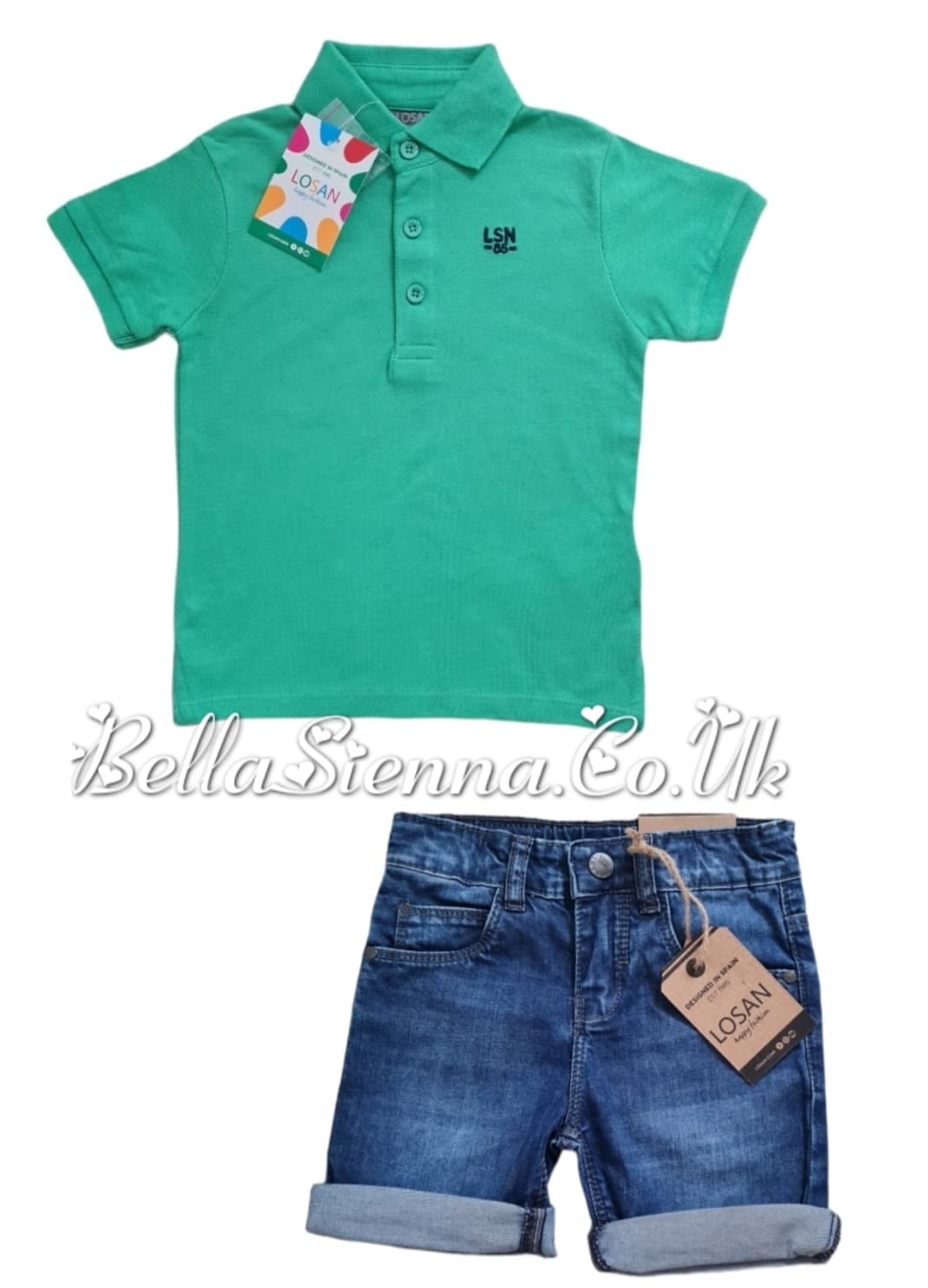 Green polo shirt and shorts set.