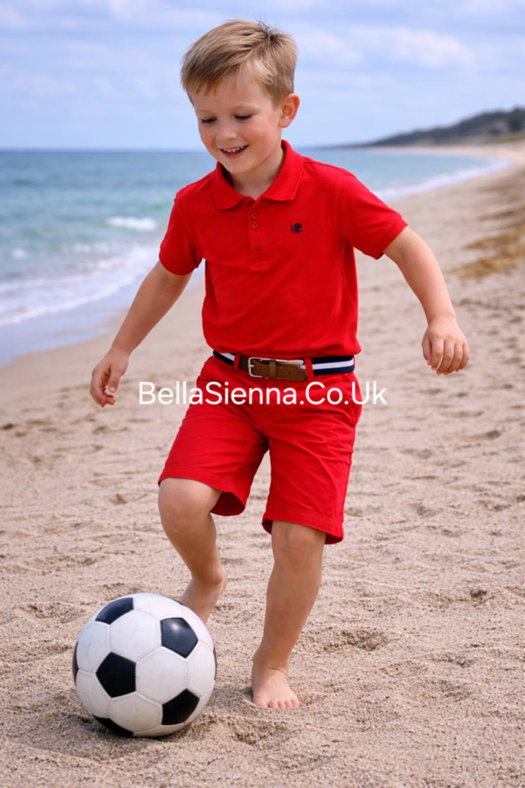 Red polo shirt and shorts set for boys. Red polo short sleeve shirt, three buttons down the front. Smart red shorts and matching belt. Four pockets. Interior adjustable waistband and push button. Double roll-up cuffs. Contrast stitching.
