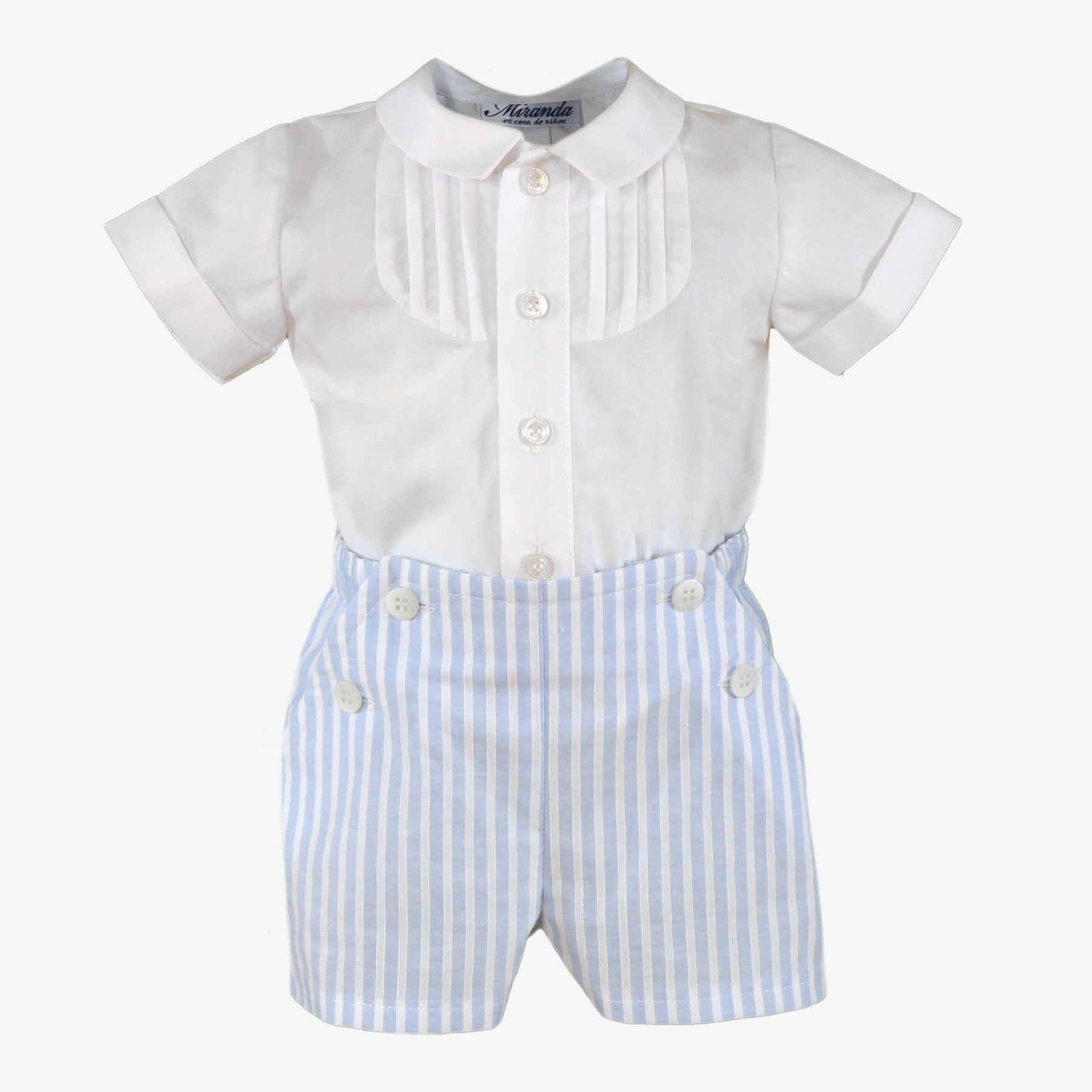 Miranda Baby Boys White & Blue Two Piece Set offers a comfortable and stylish outfit featuring a front-button shirt for easy dressing. Crafted to provide gentle wear for your little one, this set combines practicality with classic charm, making it ideal for everyday use or special occasions.