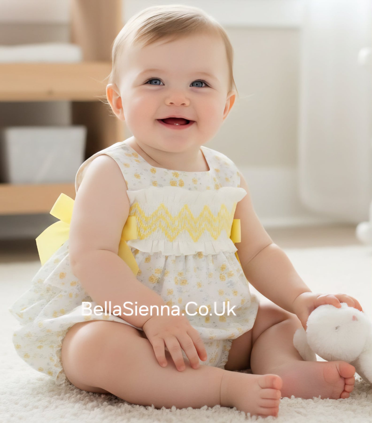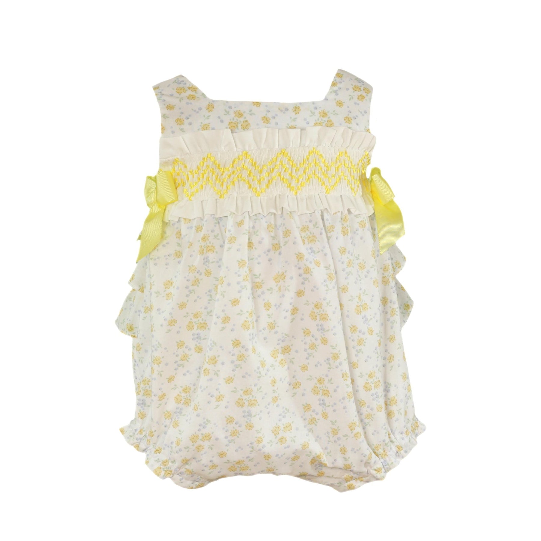The Miranda Lemon & White Smocked Romper is perfect for the spring and summer months. Crafted from lightweight fabric, it features a beautiful floral print topped off with cute bows. Soft and comfortable.