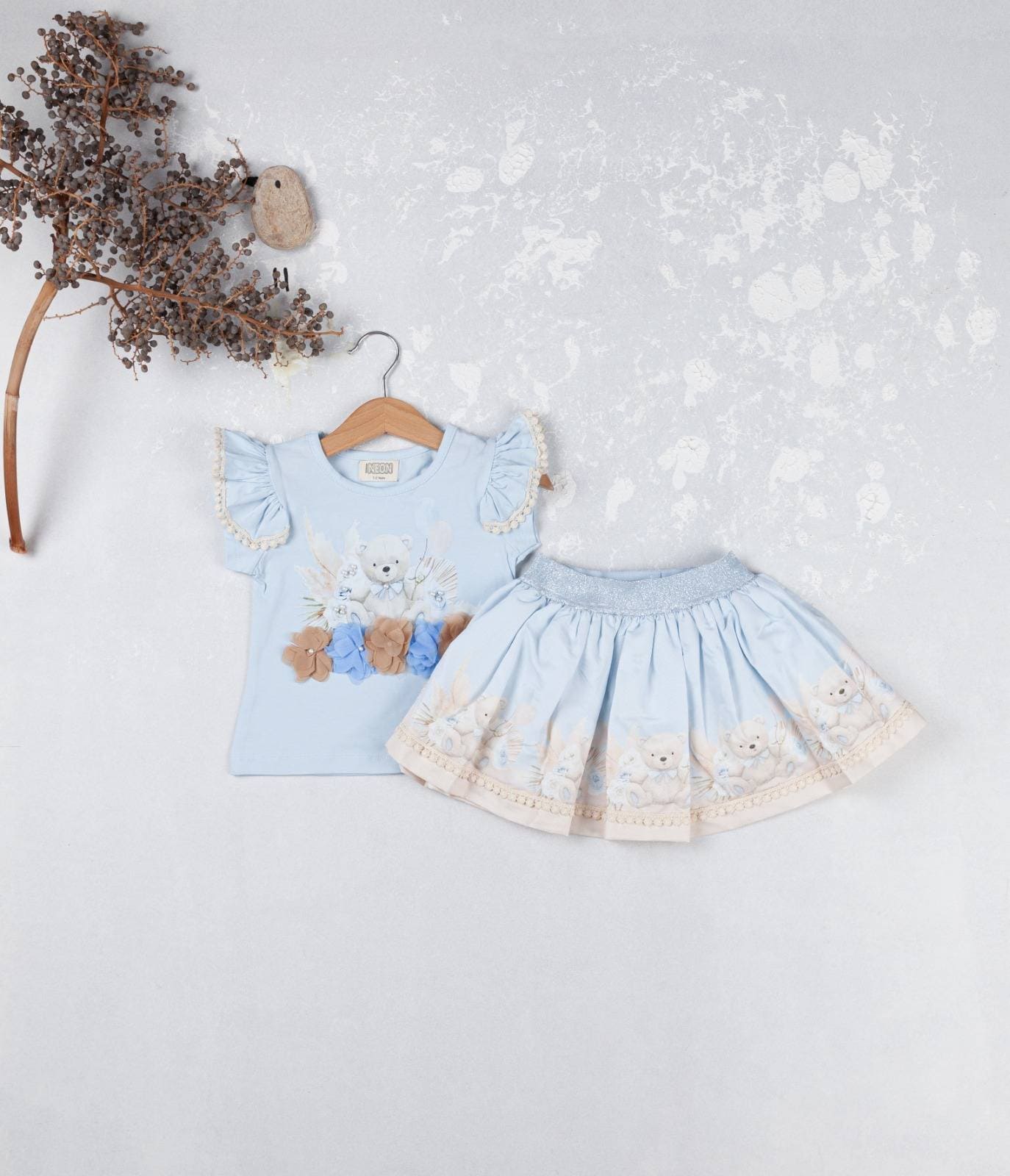 Blue & Beige Teddy Bear Pearl Deatil Skirt & Top Set - 3605