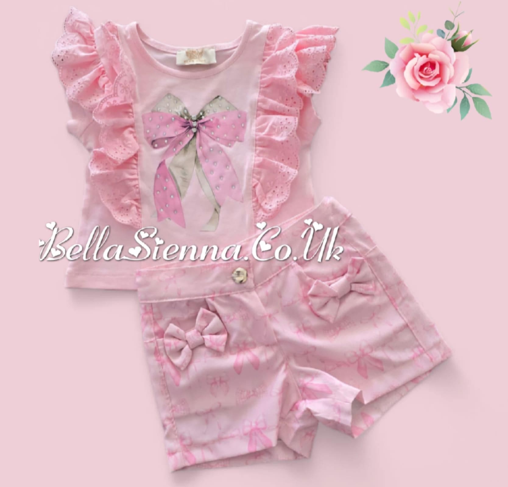 Pink "Bow" Anglaise Frill Shorts Set - S216