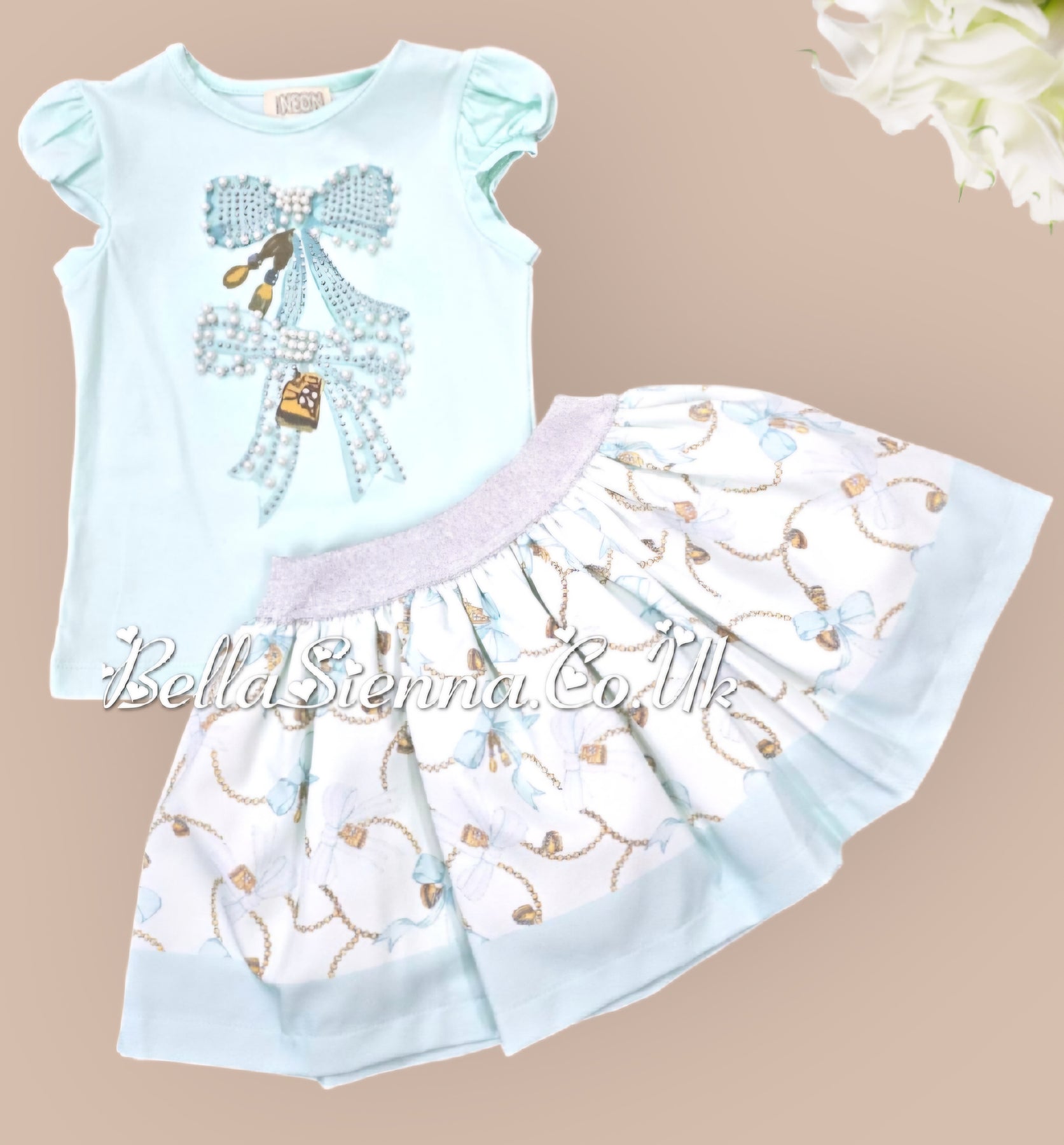 Pastel Green "Bow" Skirt & Top Set With Pearl & Sparkle Detail -3608