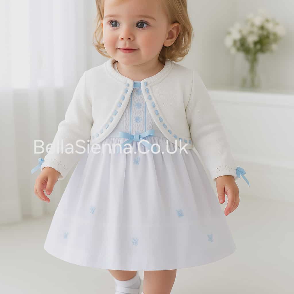 Gorgeous cardigan for girls, this white cardigan is from British designer Pretty Originals. Softly knitted, it has a blue satin ribbon running through the cuffs and around the front and back decorative bow stitched on the back. This scallop-edged piece fastens with a hidden button on the front.