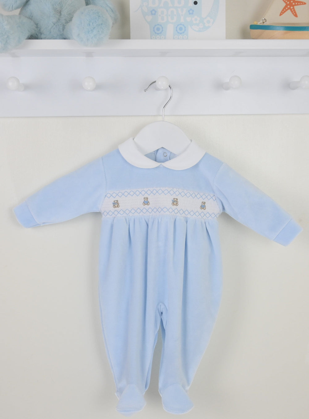 Pex Velour Smocked Teddy Bear All In One Babygrow Sleepsuit - Pale Blue -B027200700