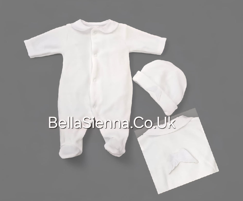Unisex White Velour Angel Wings All In One Babygrow With Matching Hat - SG137-V