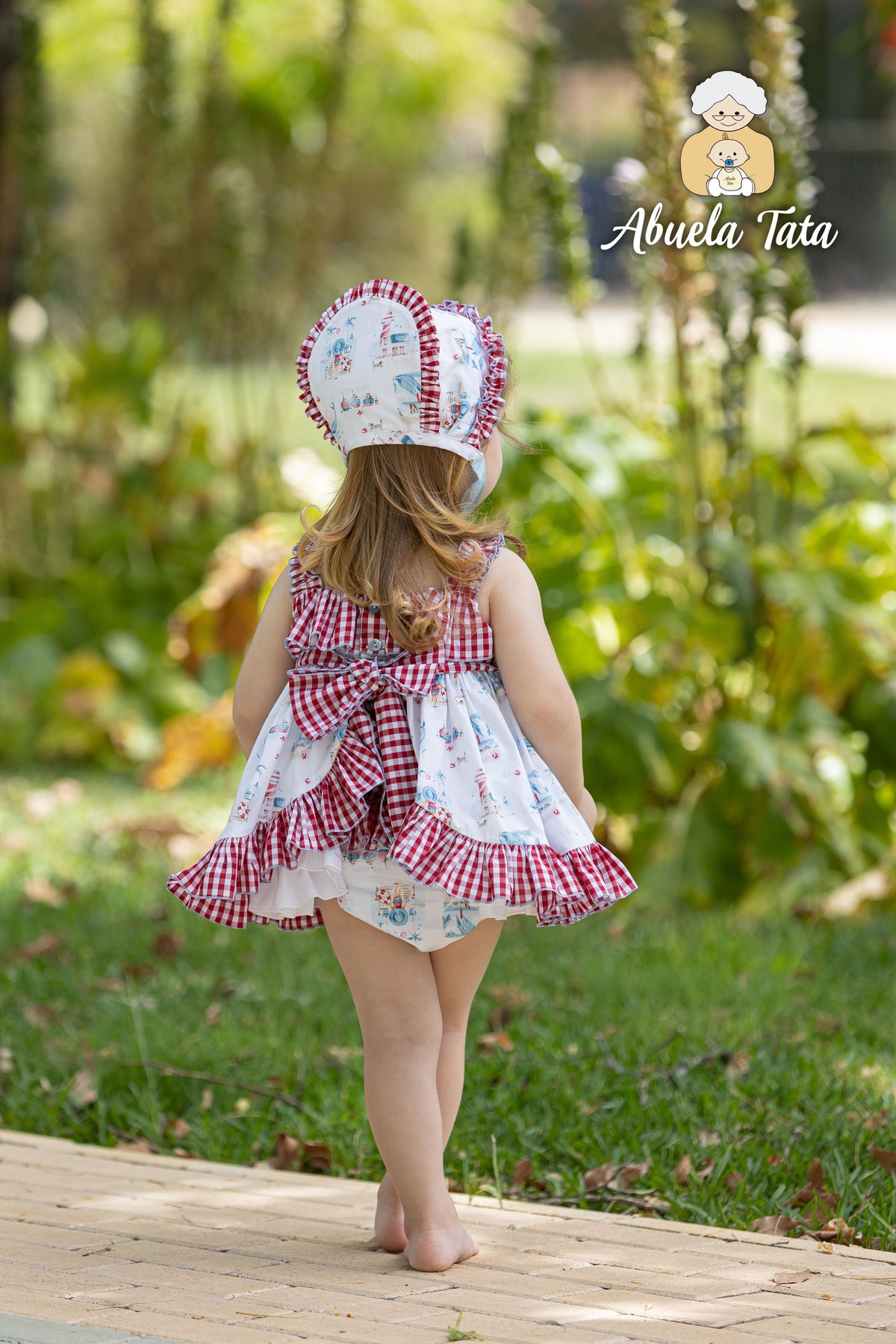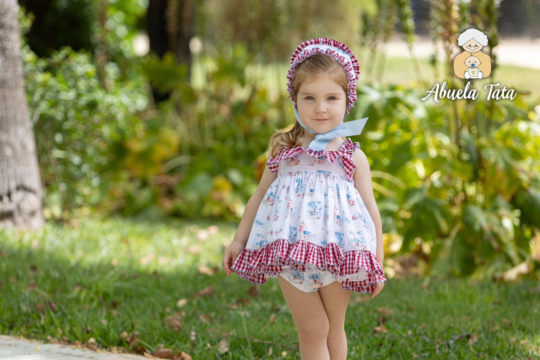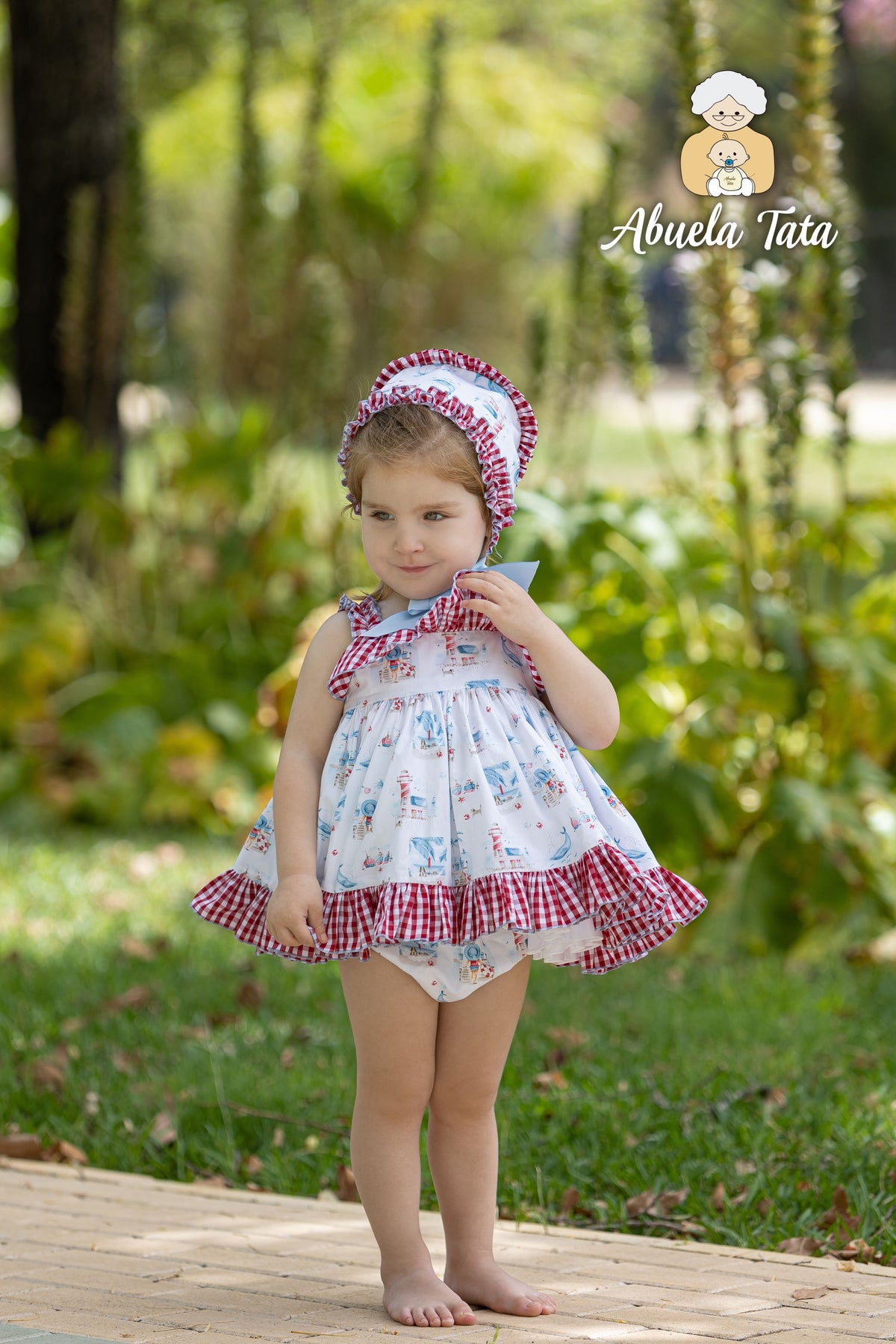 This beautiful outfit consists of the dress, pants, and bonnet, each featuring a white background with a seaside theme print and red and white gingham trim, accented with blue. The back of the dress is designed with a split detail to showcase the frilly pants, with a big bow to complete the look.