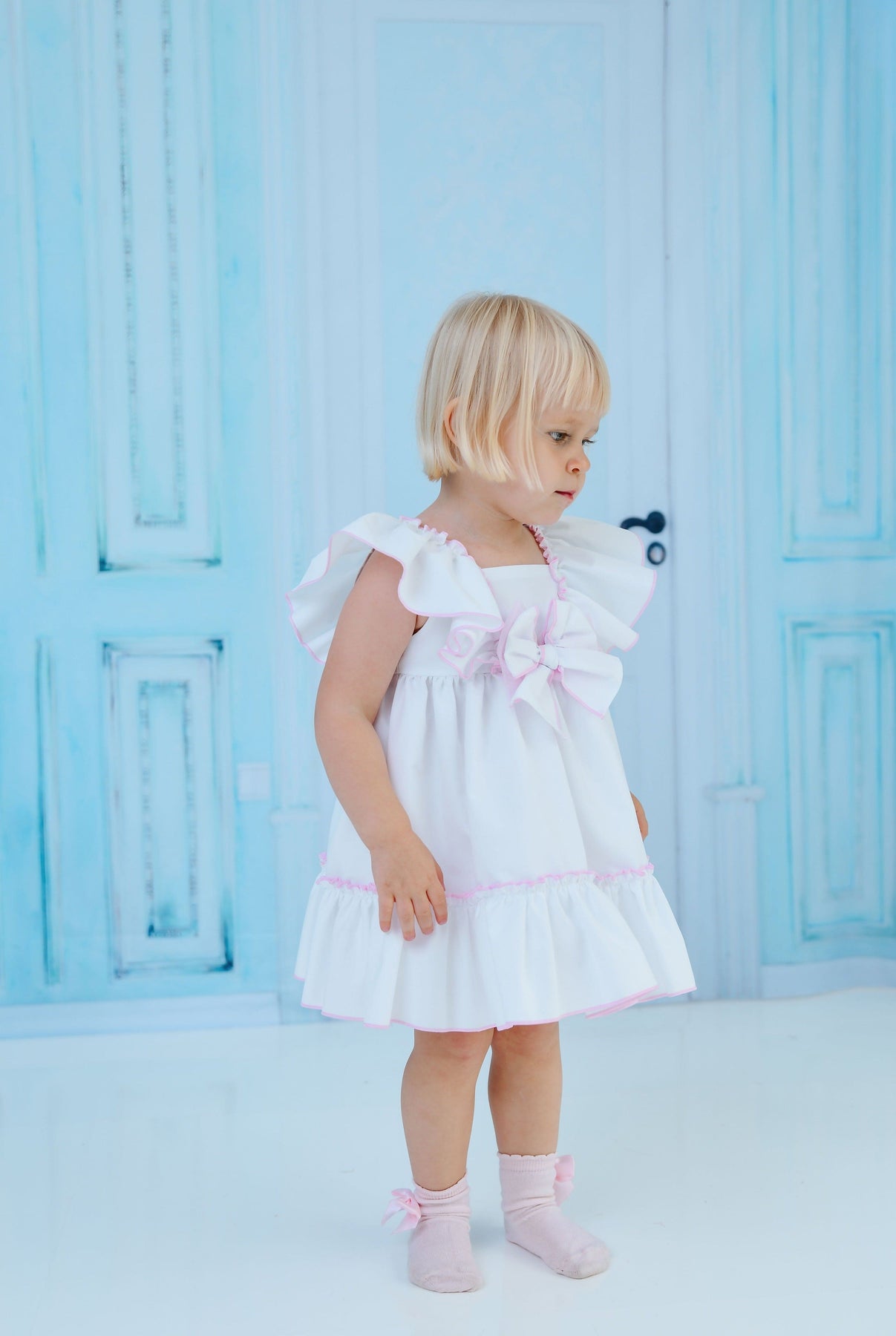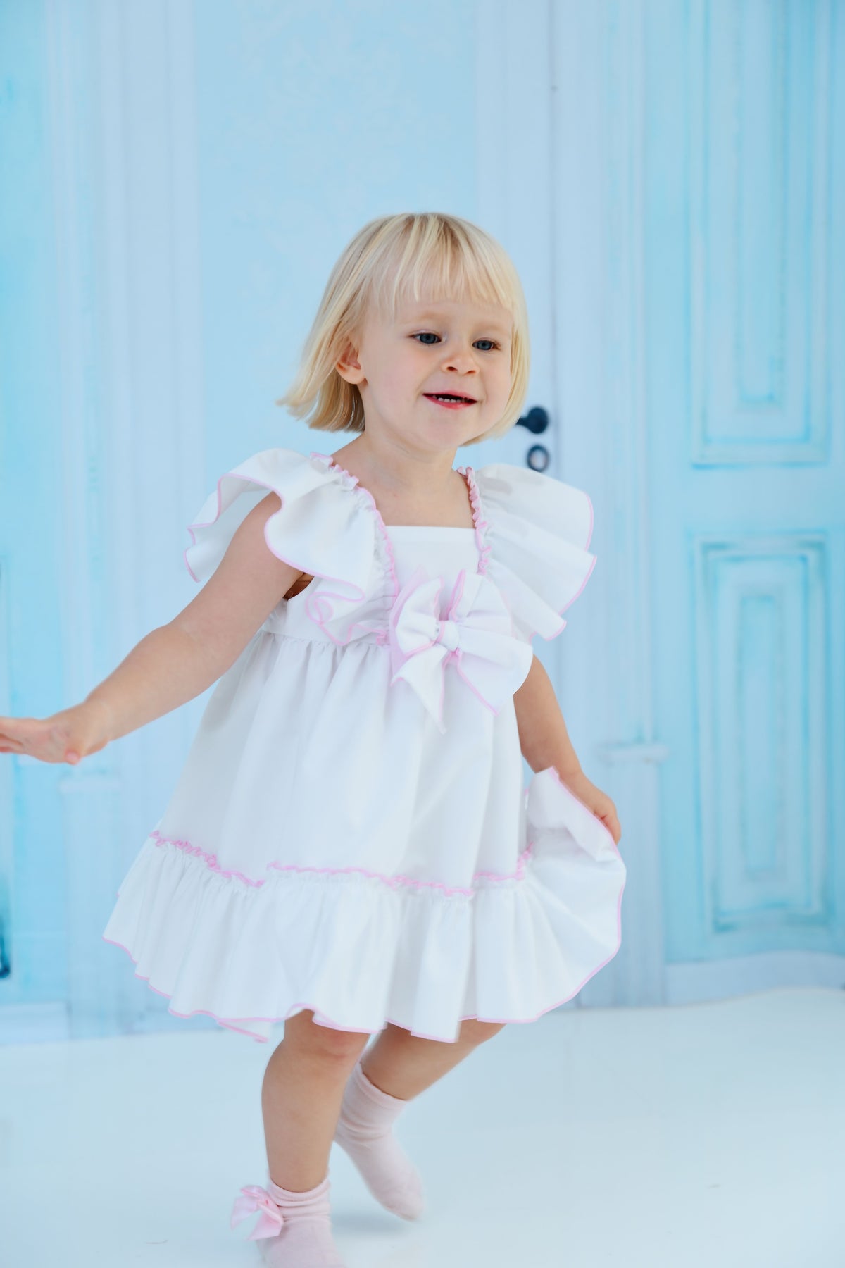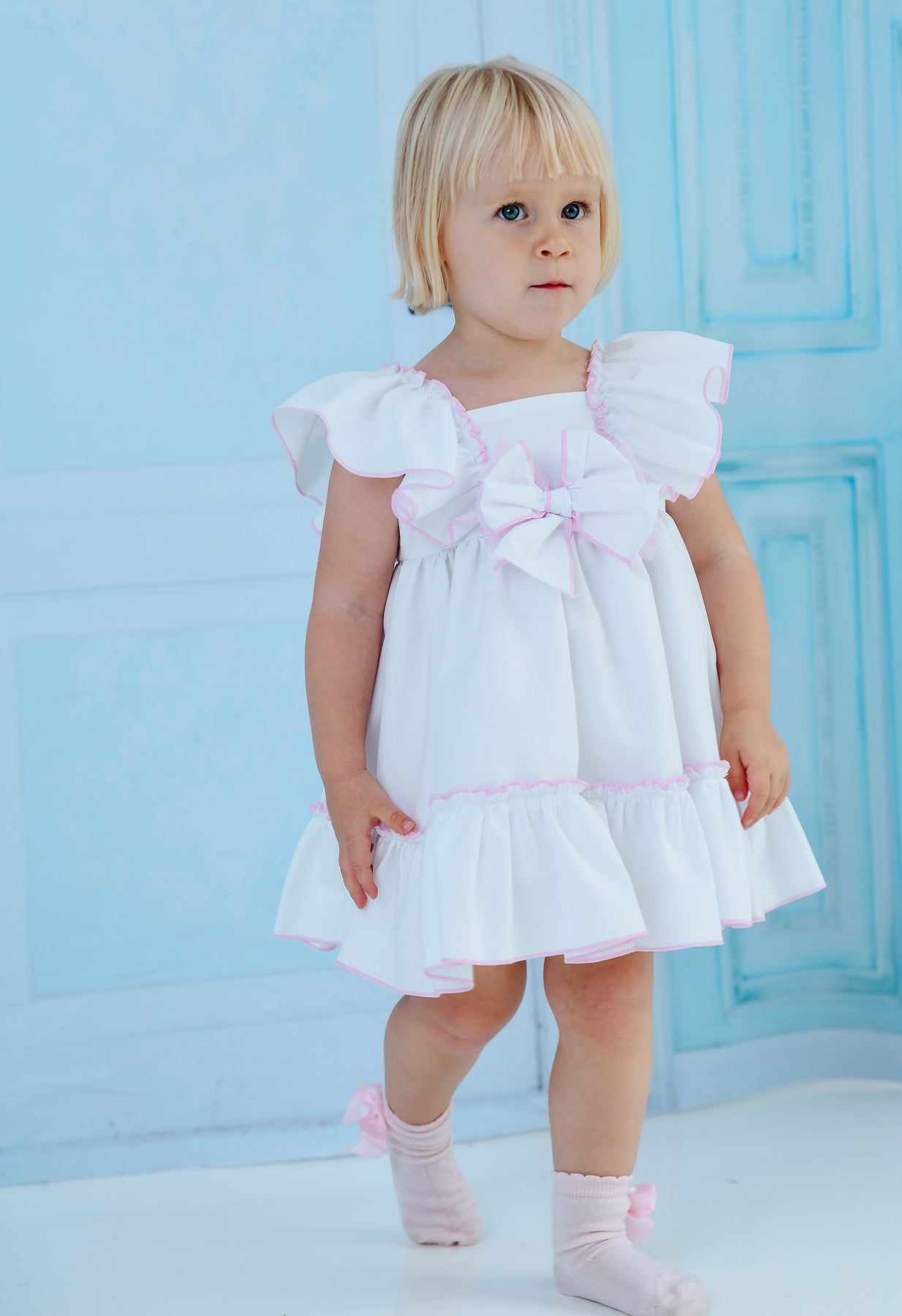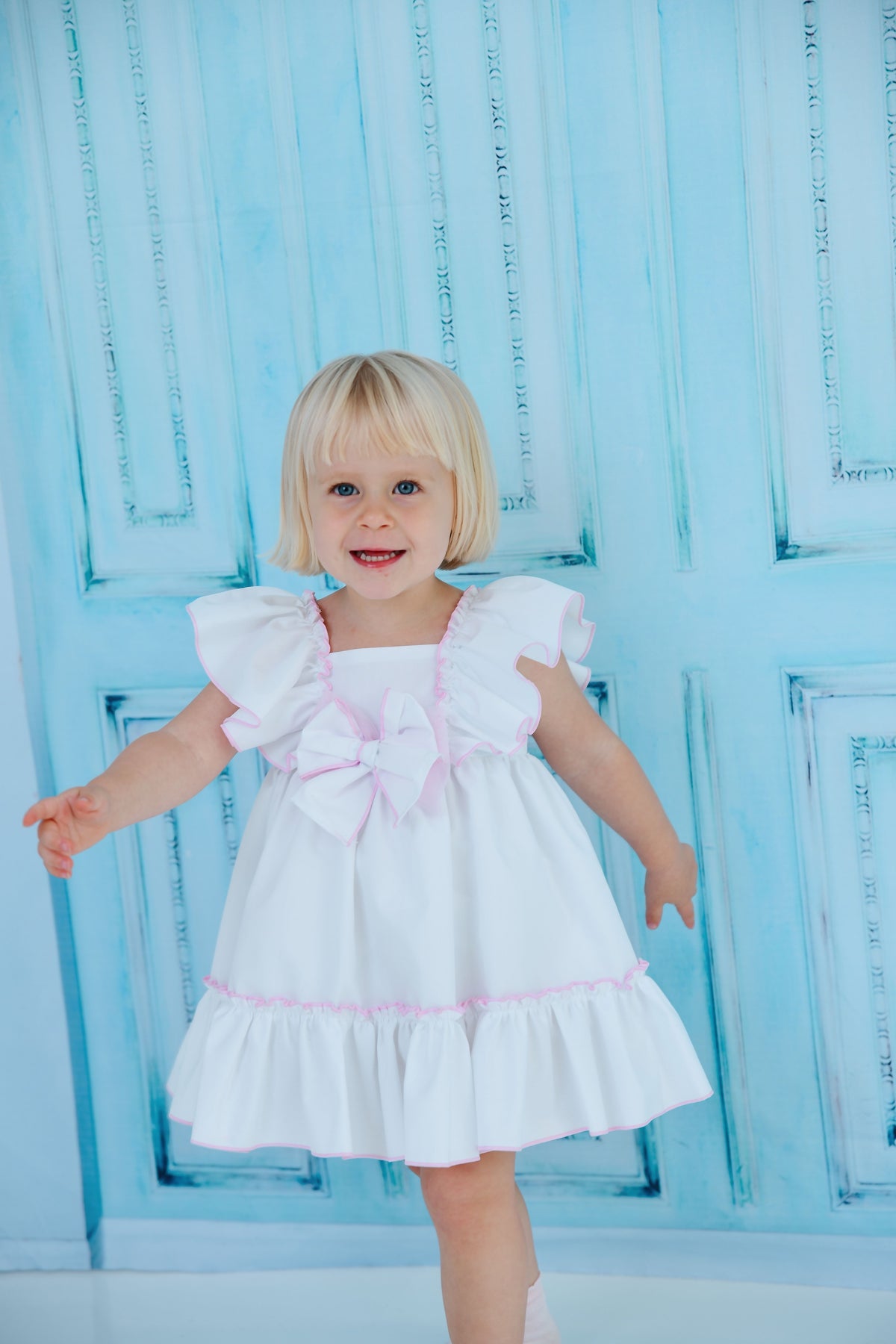 Babine White & Pink Dress is perfect for any occasion with its delicate ruffles and elegant bow and button fastening at the back. Made from high-quality fabric. Perfect dress for any occaision!