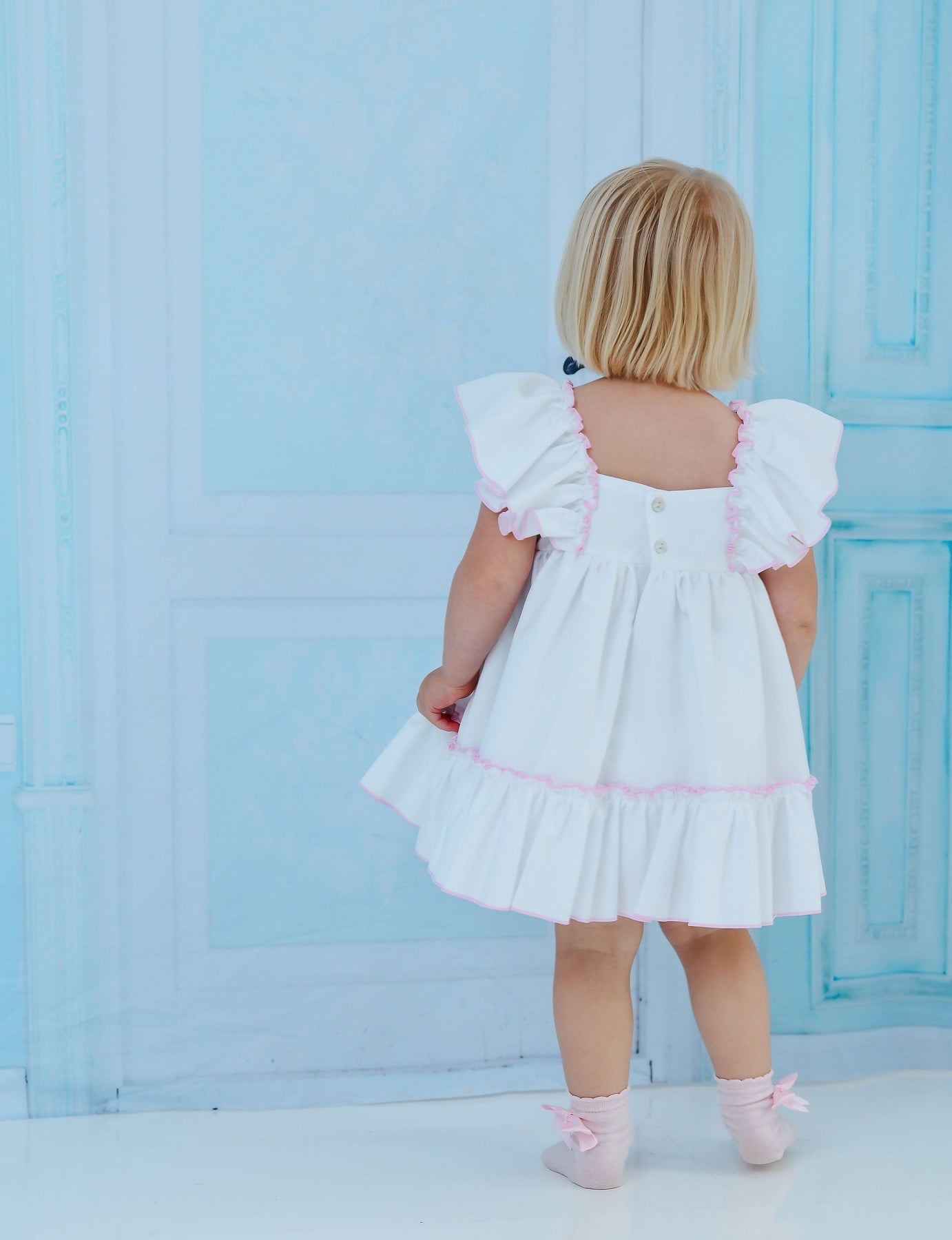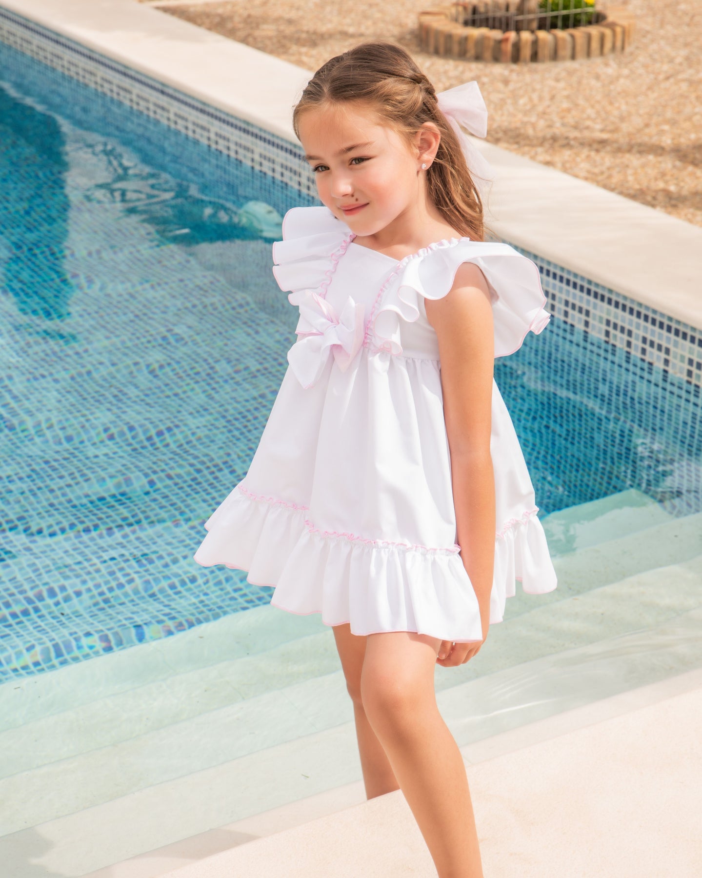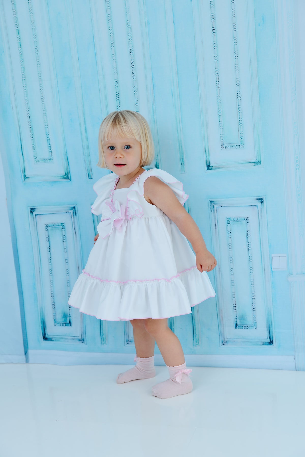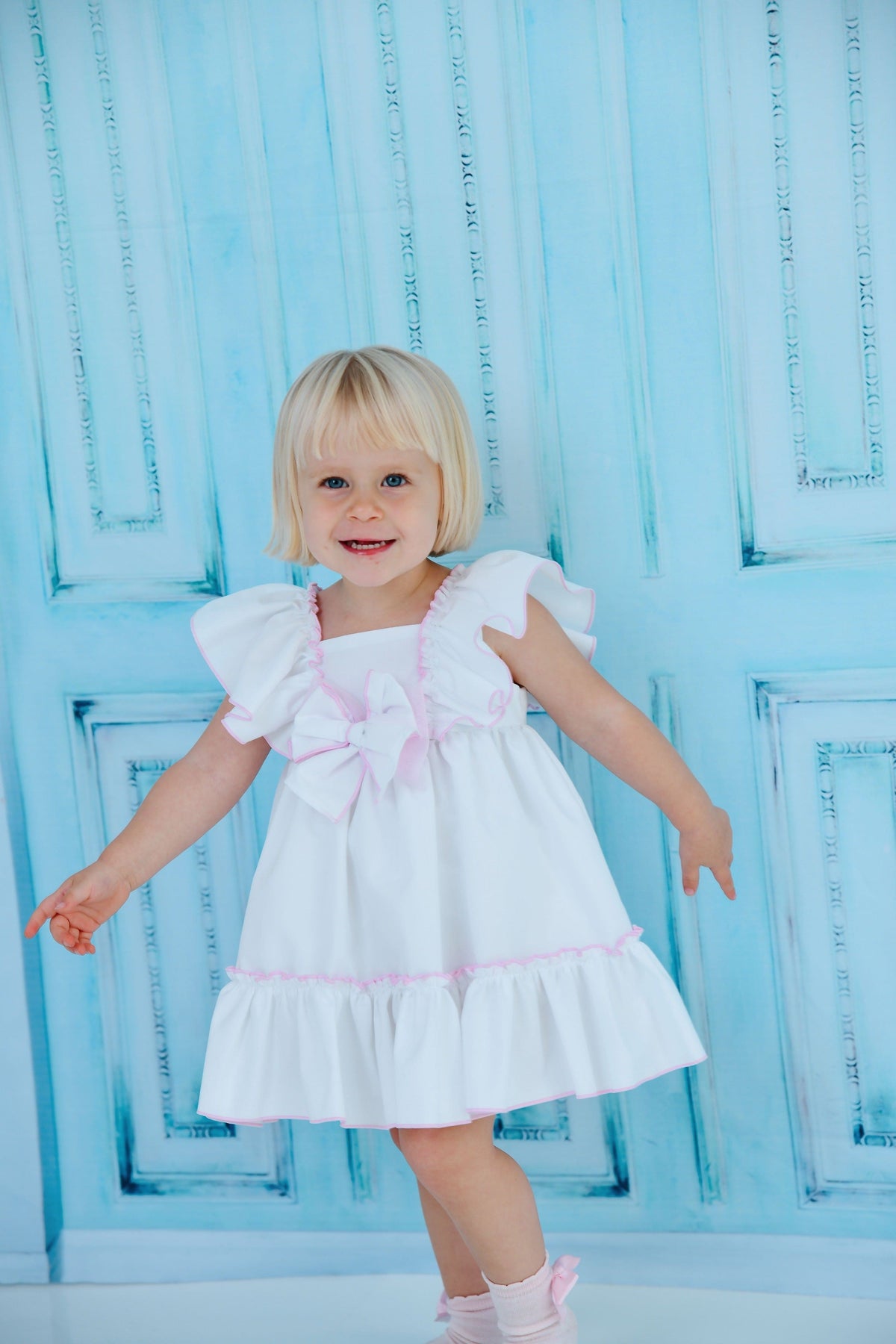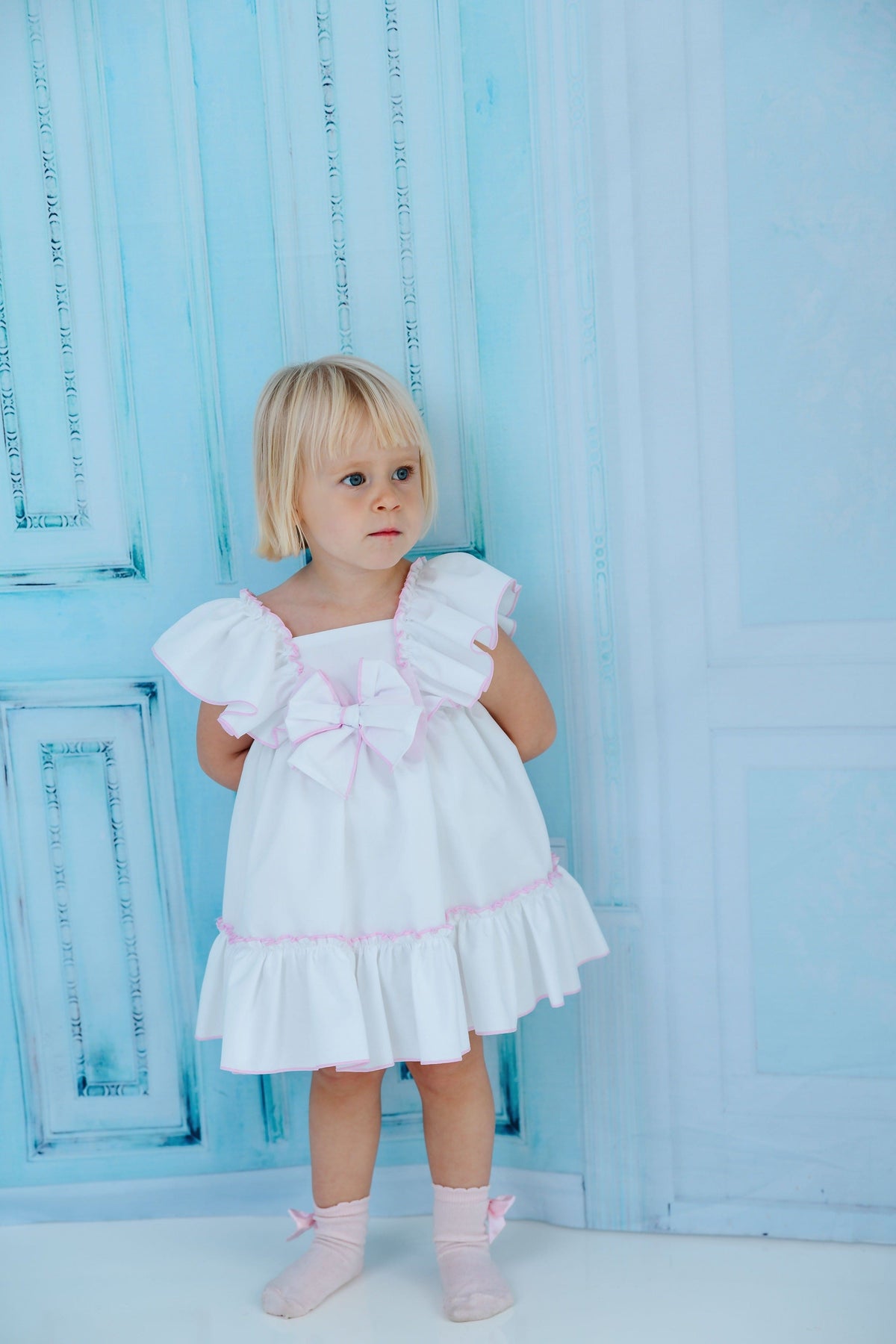 Babine White & Pink Dress is perfect for any occasion with its delicate ruffles and elegant bow and button fastening at the back. Made from high-quality fabric. Perfect dress for any occaision!