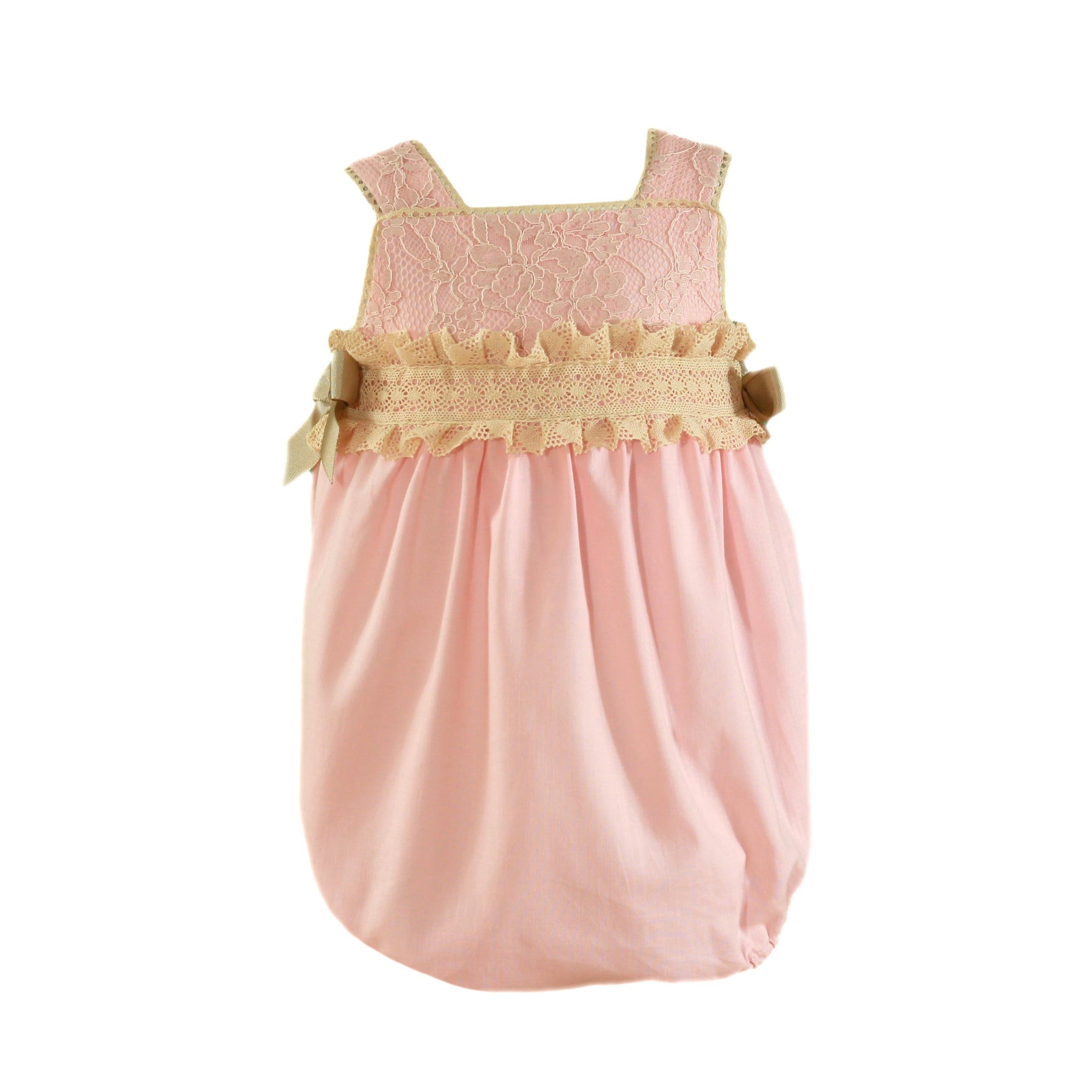 This Beautiful Miranda Coral & Beige Romper is perfect for your little one. It features a delicate lace bodice with two beautiful beige bows, and buttons down the back and between the legs for easy changing.