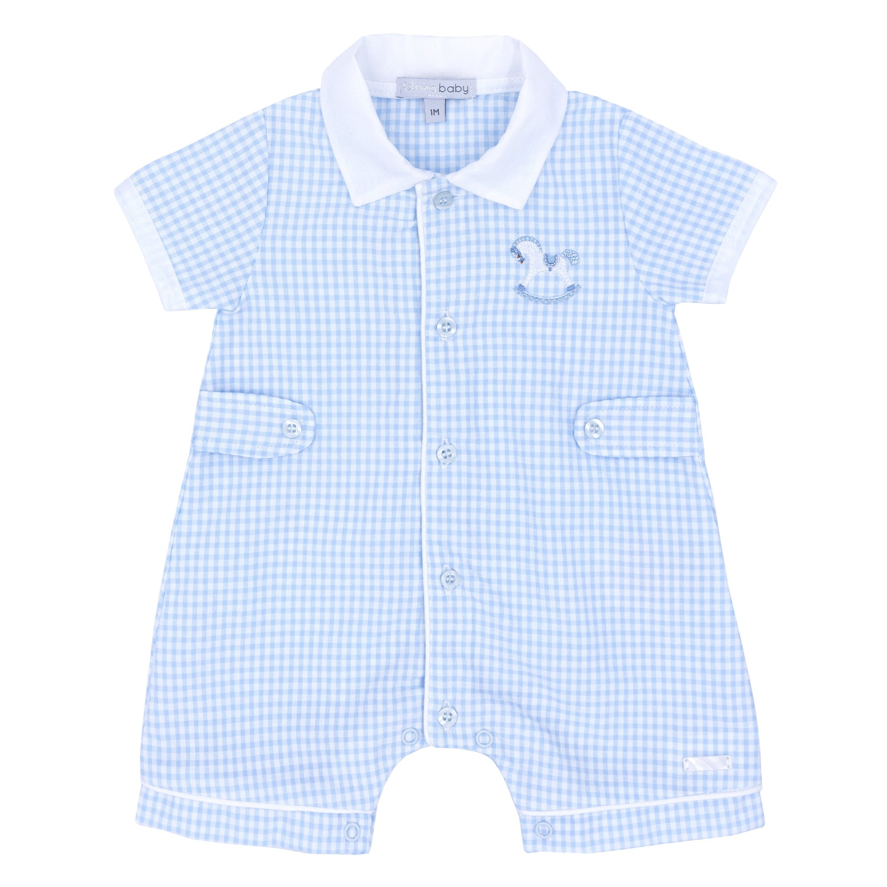 Blues Baby Boys Seersucker Romper With Peter Pan Collar & Rocking Horse Applique - BB1027