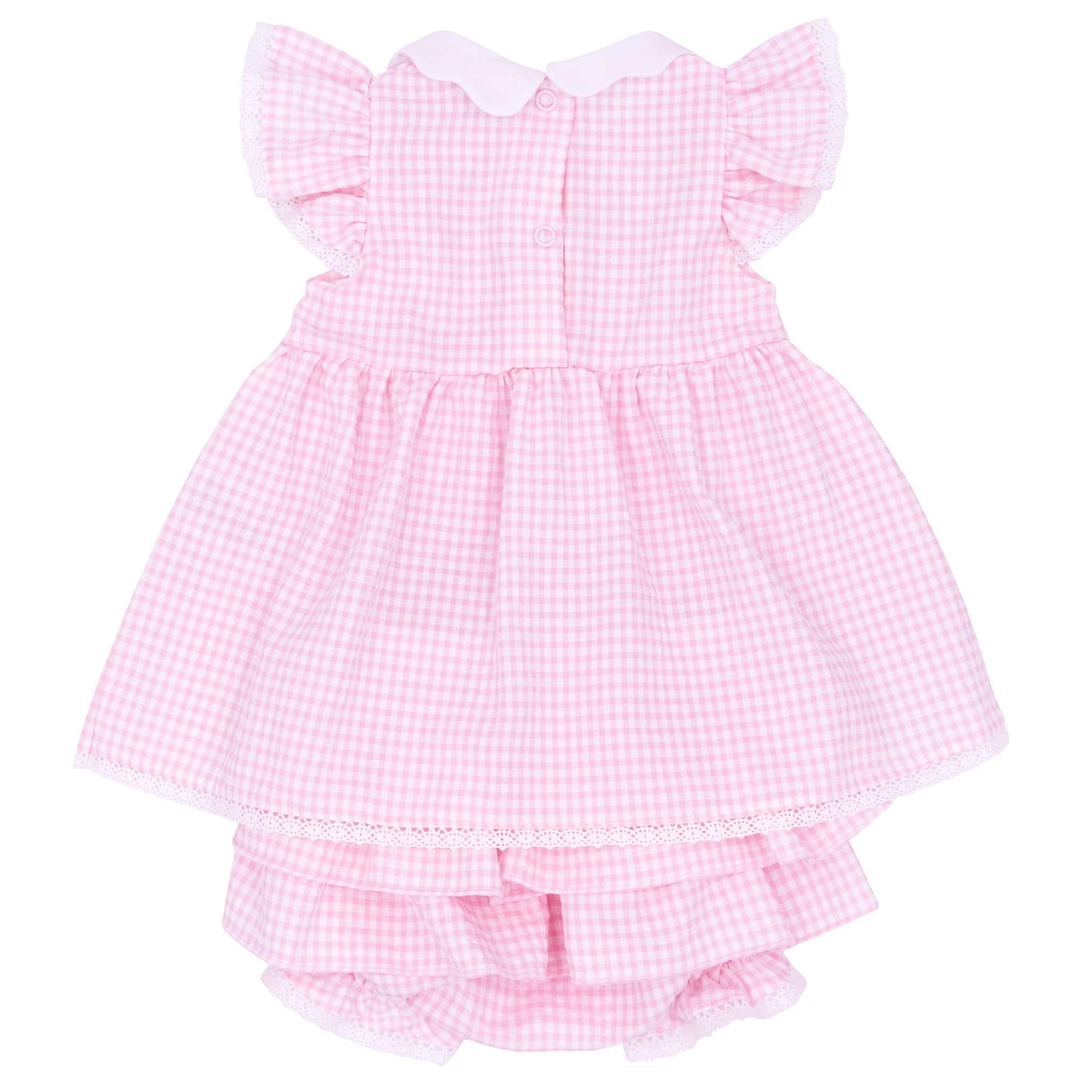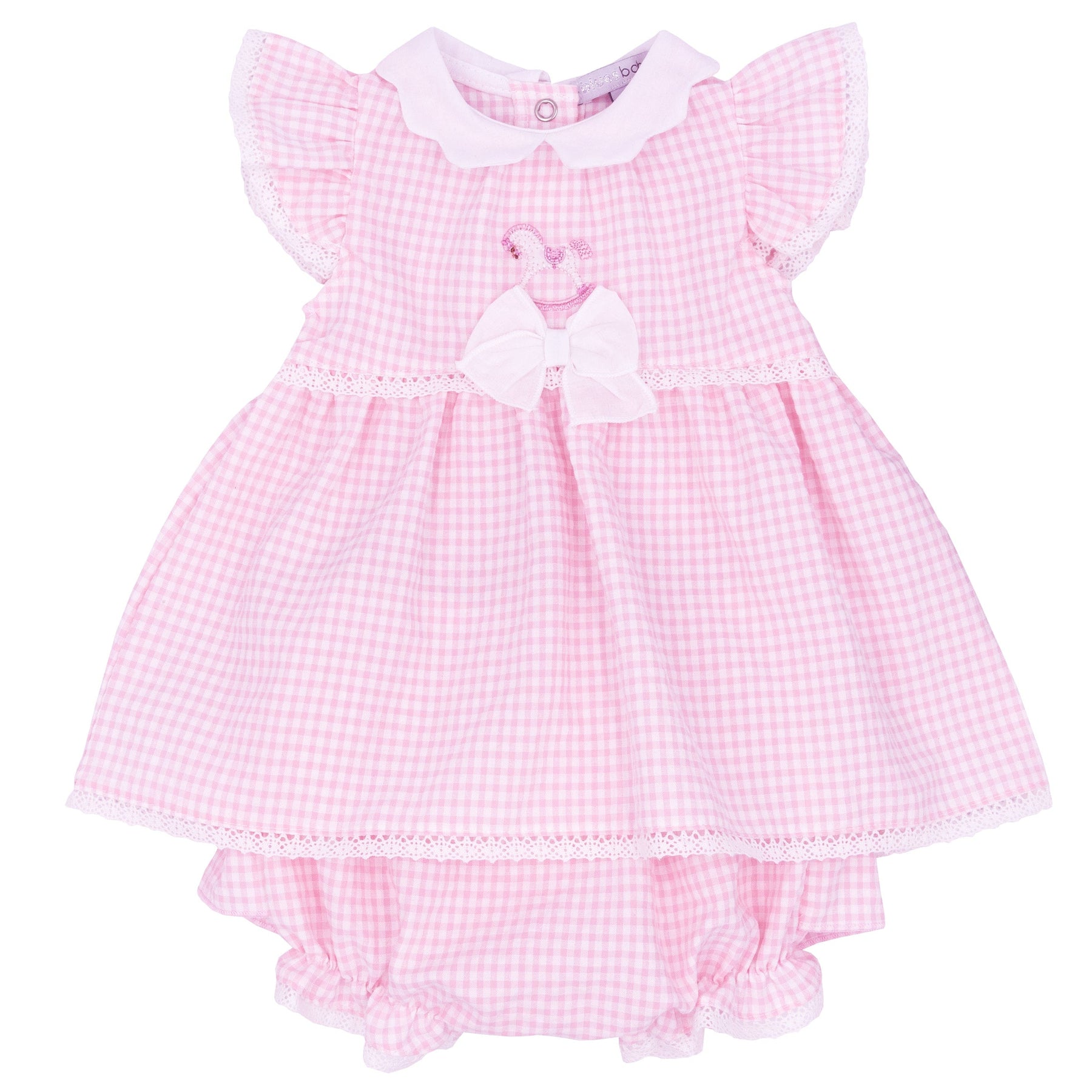 Blues Baby Girls Lined Seersucker Dress & Bloomers. Crafted from a lightweight seersucker fabric, this ensemble is finished with a rocking horse pattern. An adorable look for any special occasion.
