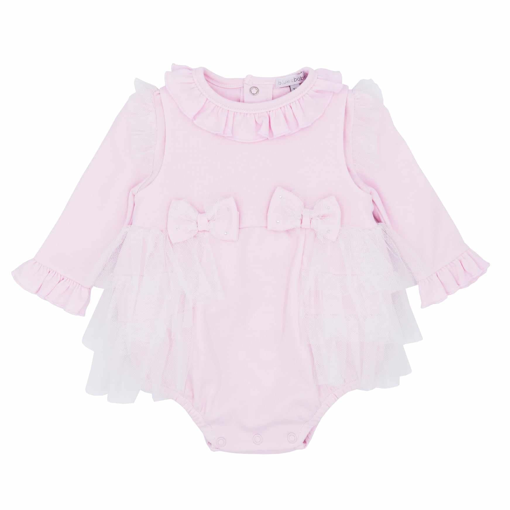 Blues Baby Pink Diamante Bow Romper features a delicate ruffle collar and cuffs, tulle ruffles down both sides, and convenient popper fastenings at the back and between the legs. Your baby will be comfortable and cute in this romper.