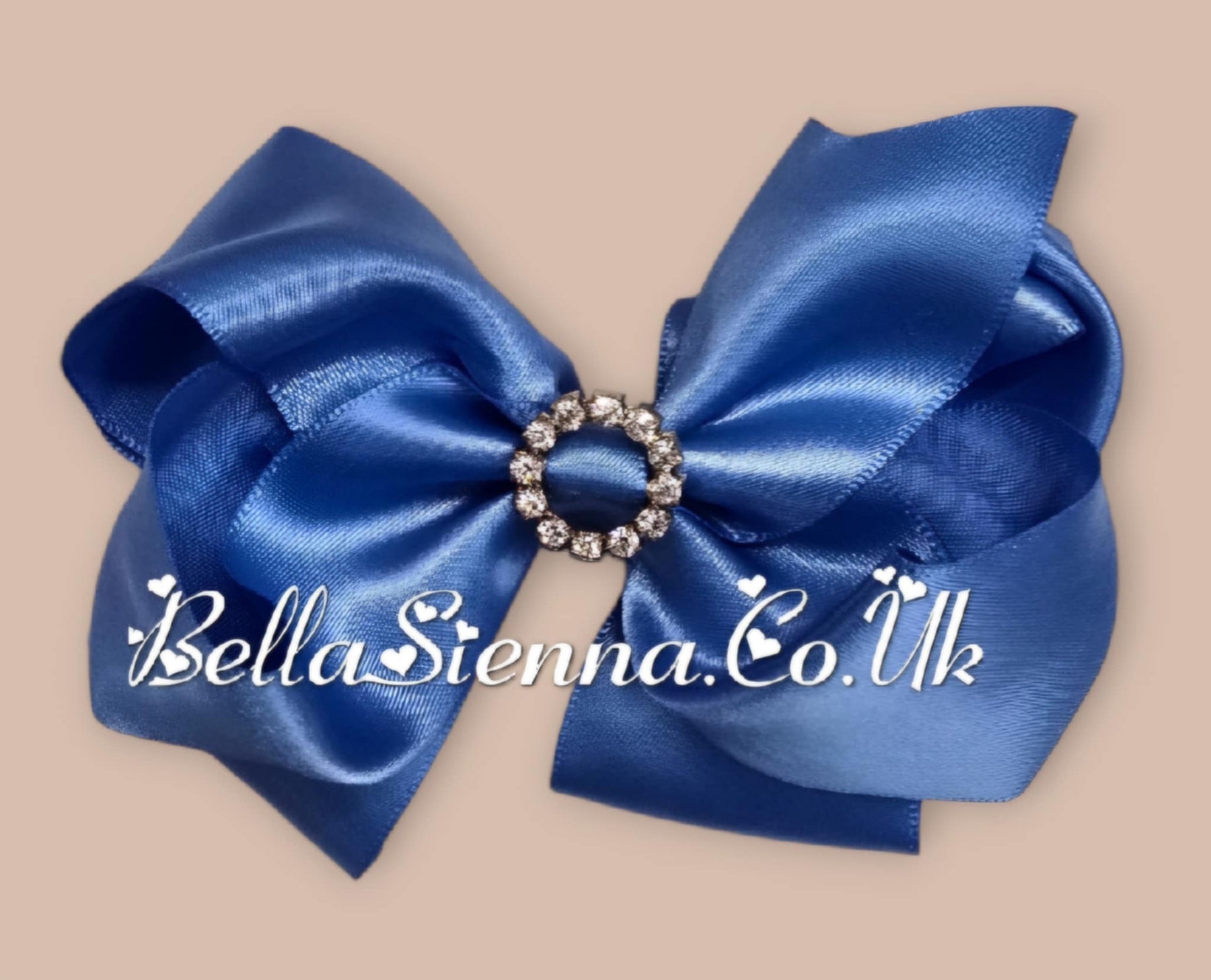 Bowtique London 4 Inch Blue Satin Medium Size Hair Bow With Diamanté Centre