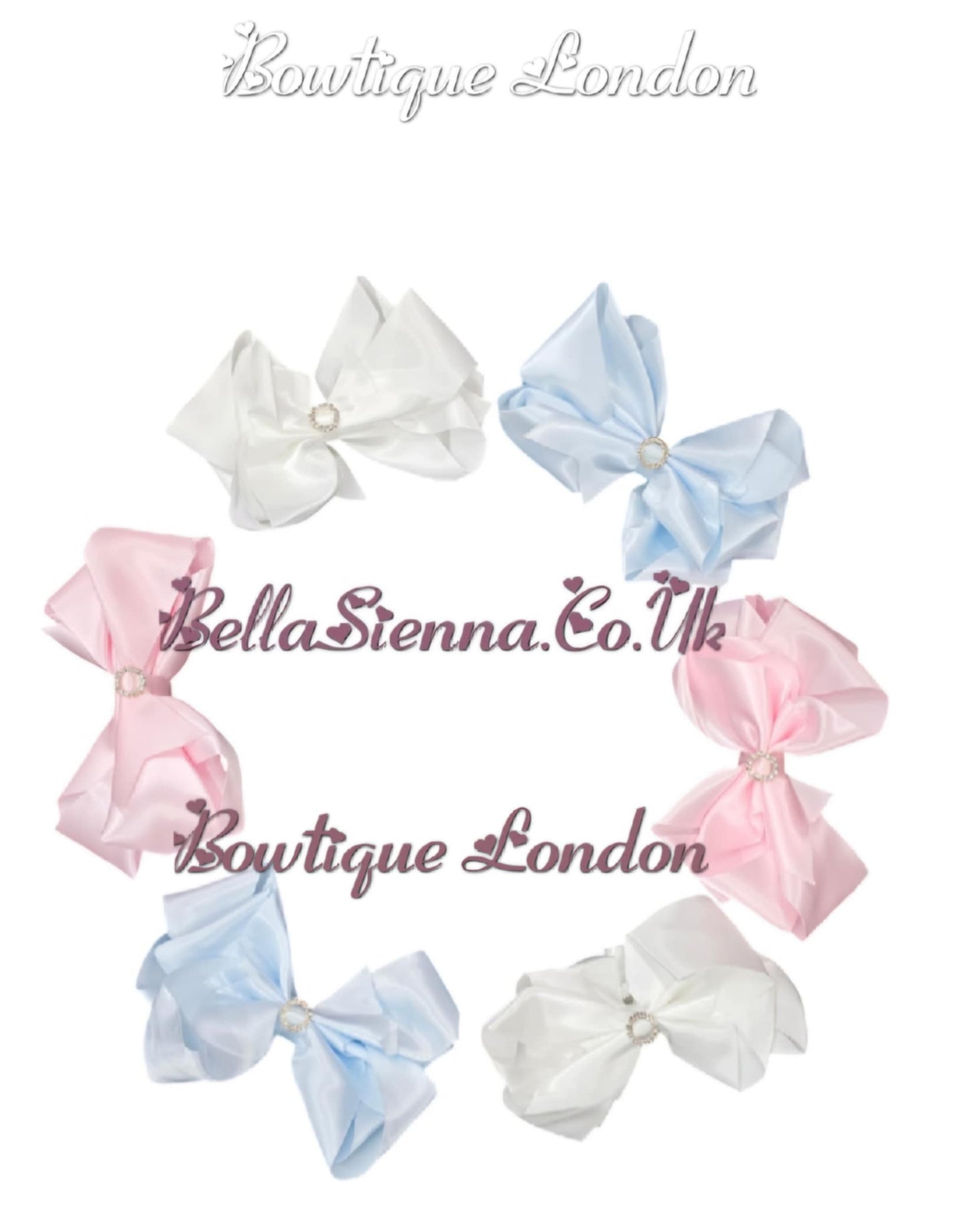 Girls hair clip approximately 6" by Bowtique London with a diamanté centre lovely to complement any outfit. The bow is handmade in delicate grosgrain ribbon and set on a slide-in metal clip.