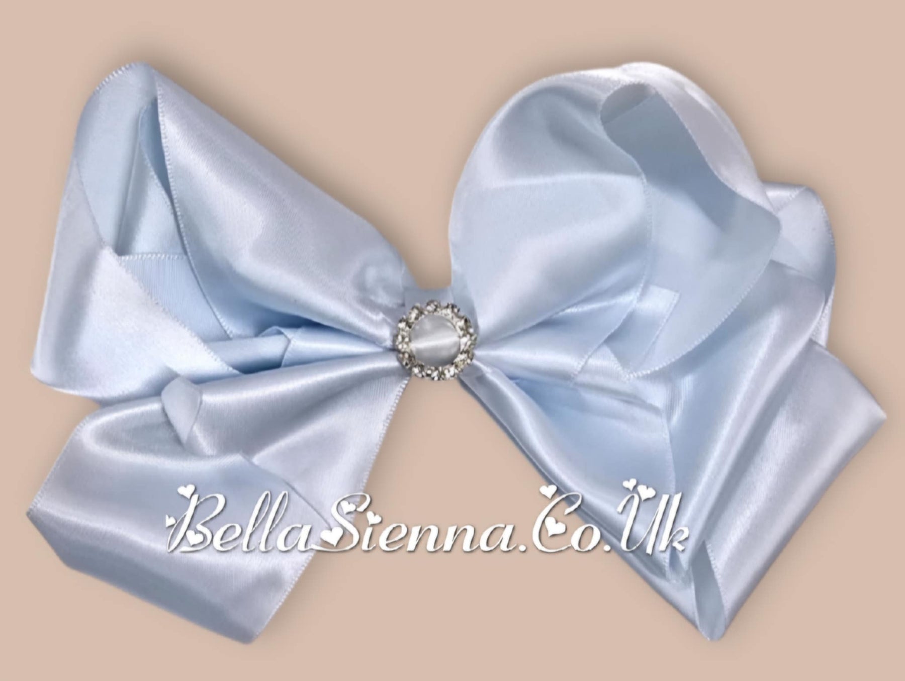 Bowtique London 6 Inch Blue Satin Large Hair Bow With Diamanté Centre