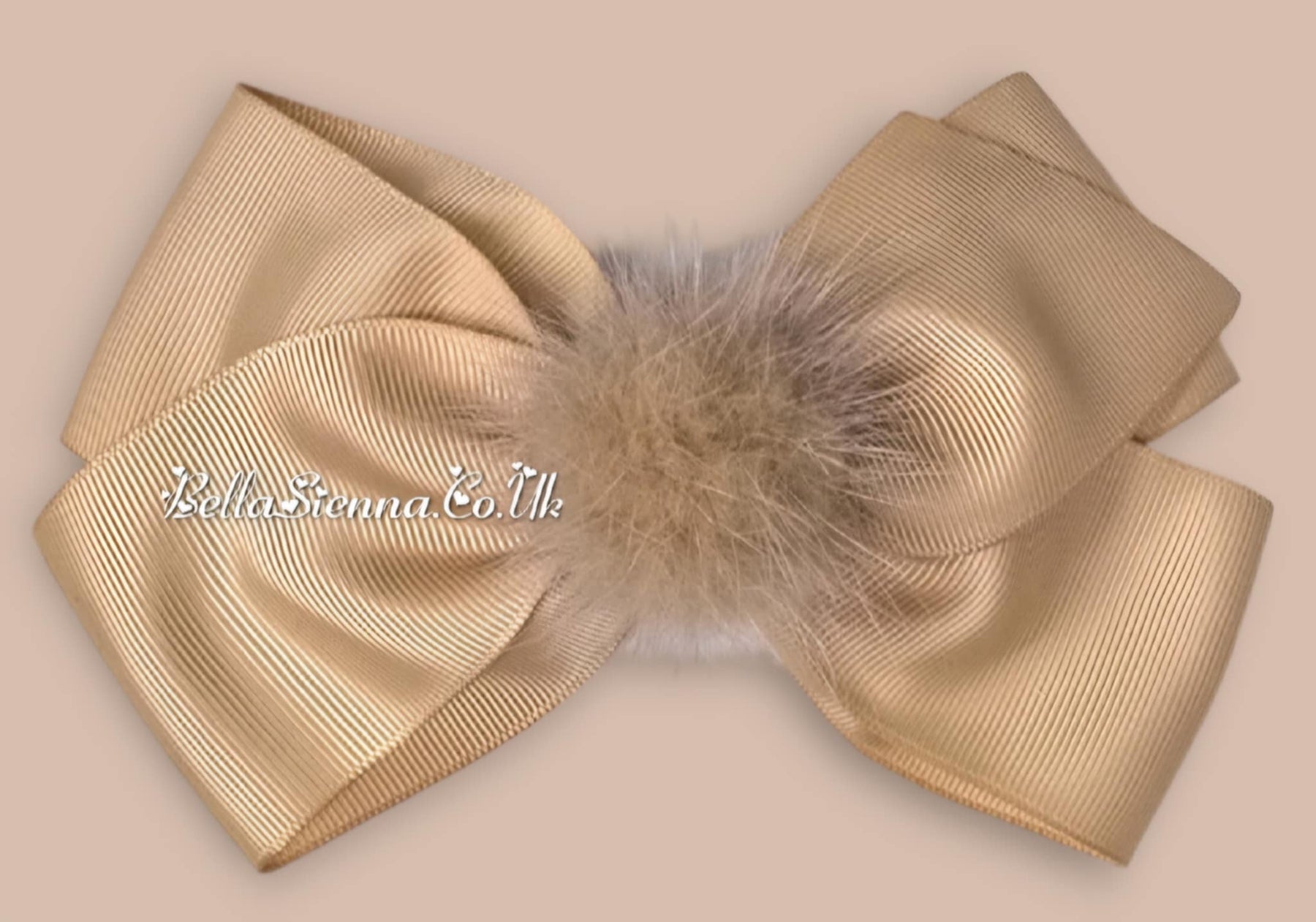 Bowtique London 4 Inch Beige Grosgrain Medium Size Hair Bow With Fur Pom